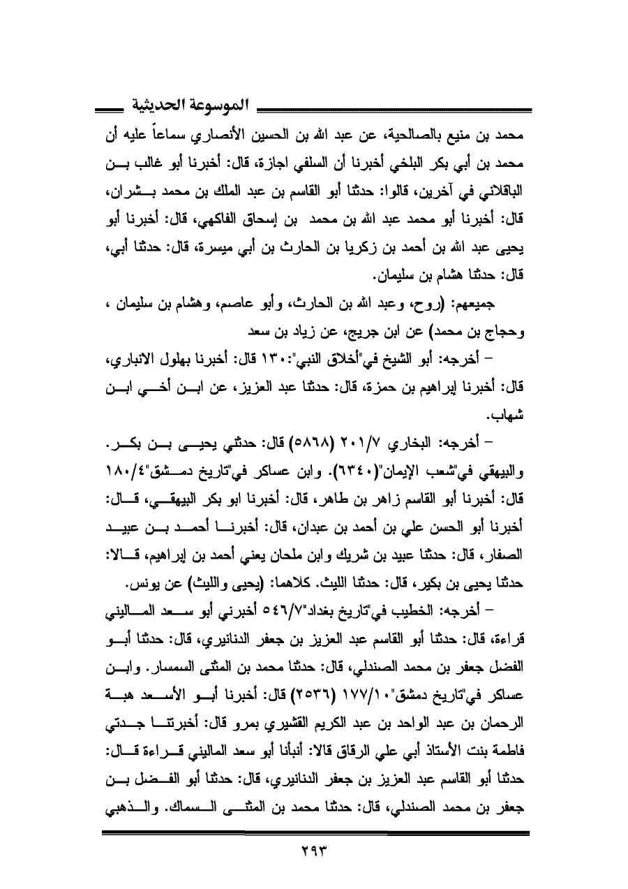 محمد بن منيع بالصالحية، عن عبد اللَّه بن الحسين الأنصاري سماعًا عليه أن محمد بن أبي بكر البلخي أخبرنا أن السلفى اجازة، قال: أخبرنا أبو غالب بن الباقلاني في آخرين، قالوا: حدثنا أبو القاسم بن عبد الملك بن محمد بشران، قال: أخبرنا أبو محمد عبد اللَّه بن محمد بن إسحاق الفاكهي، قال: أخبرنا أبو يحيى عبد اللَّه بن أحمد بن زكريا بن الحارث بن أبي ميسرة، قال: حدثنا أبي، قال: حدثنا هشام بن سليمان.