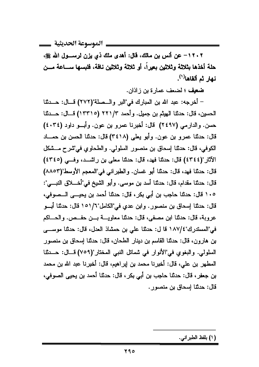 ١٢٠٢ - عن أنس بن مالك، قال: اهدى مالك ذي يزن لرسول اللَّه -صلى اللَّه عليه وسلم-، حلة أخذها بثلاثة وثلاثين بعيرًا، أو ثلاثة وثلاثين ناقة، فلبسها ساعة من نهار ثم ألقاها (¬١).