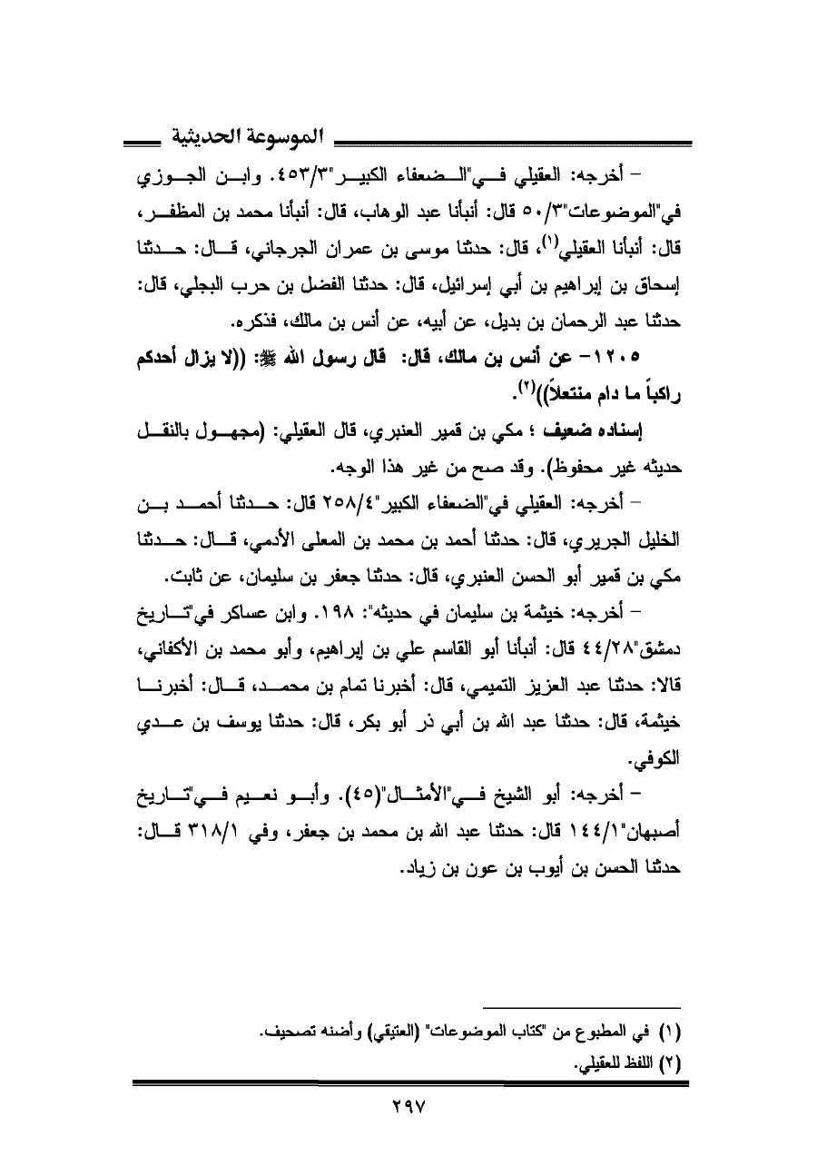 ١٢٠٥ - عن أنس بن مالك، قال: قال رسول اللَّه -صلى اللَّه عليه وسلم-: "لا يزال أحدكم راكبًا ما دام منتعلًا" (¬٢).