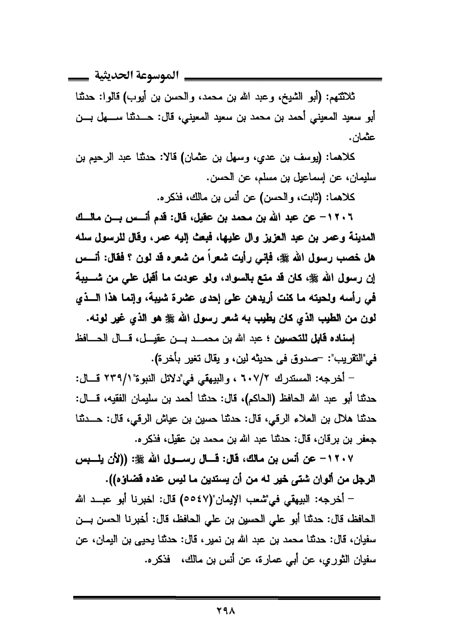 ١٢٠٦ - عن عبد اللَّه بن محمد بن عقيل، قال: قدم أنس بن مالك المدينة وعمر بن عبد العزيز وال عليها، فبعث إليه عمر، وقال للرسول سله هل خصب رسول اللَّه -صلى اللَّه عليه وسلم-، فإني رأيت شعرًا من شعره قد لون؟ فقال: أنس إن رسول اللَّه -صلى اللَّه عليه وسلم-، كان قد متع بالسواد، ولو عودت ما أقبل علي من شيبة في رأسه ولحيته ما كنت أريدهن على إحدى عشرة شيبة، وإنما هذا الذي لون من الطيب الذي كان يطيب به شعر رسول اللَّه -صلى اللَّه عليه وسلم- هو الذي غير لونه.