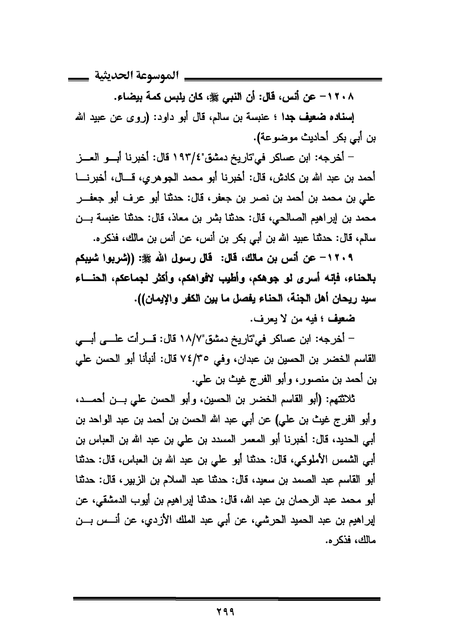 ١٢٠٩ - عن أنس بن مالك، قال: قال رسول اللَّه -صلى اللَّه عليه وسلم-: "شربوا شيبكم بالحناء، فإنه أسرى لوجوهكم، وأطيب لافواهكم، وأكثر لجماعكم، الحناء سيد ريحان أهل الجنة، الحناء يفصل ما بين الكفر والإِيمان".