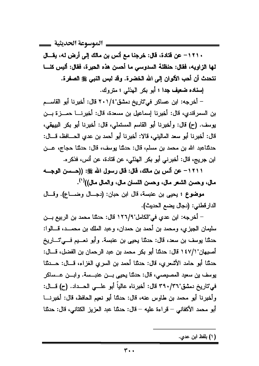 ١٢١٠ - عن قتادة، قال: خرجنا مع أنس بن مالك إلى أرض له، يقال لها الزاوية، فقال: حنظلة السدوسي ما أحسن هذه الحبرة، فقال: أليس كنا نتحدث أن أحب الألوان إلى اللَّه الخضرة. وقد لبس النبي -صلى اللَّه عليه وسلم- الصفرة.
