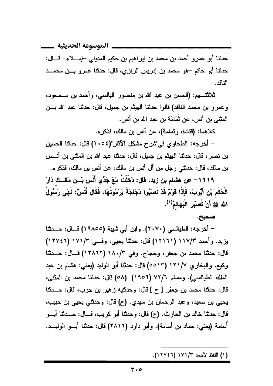 ١٢١٩ - عن هشام بن زيد، قال: دَخَلْتُ مَعَ جَدِّي أَنَس بْنِ مَالِكٍ دَارَ الْحَكَمِ بْنِ أَيُّوبَ، فَإِذَا قَوْمٌ قَدْ نَصَبُوا دَجَاجَةً يرْمُونَهَا، فَقَالَ أَنَسٌ: نَهَى رَسُولُ اللَّه -صلى اللَّه عليه وسلم- أَنْ تُصْبَرَ الْبَهَائِمُ (¬١).