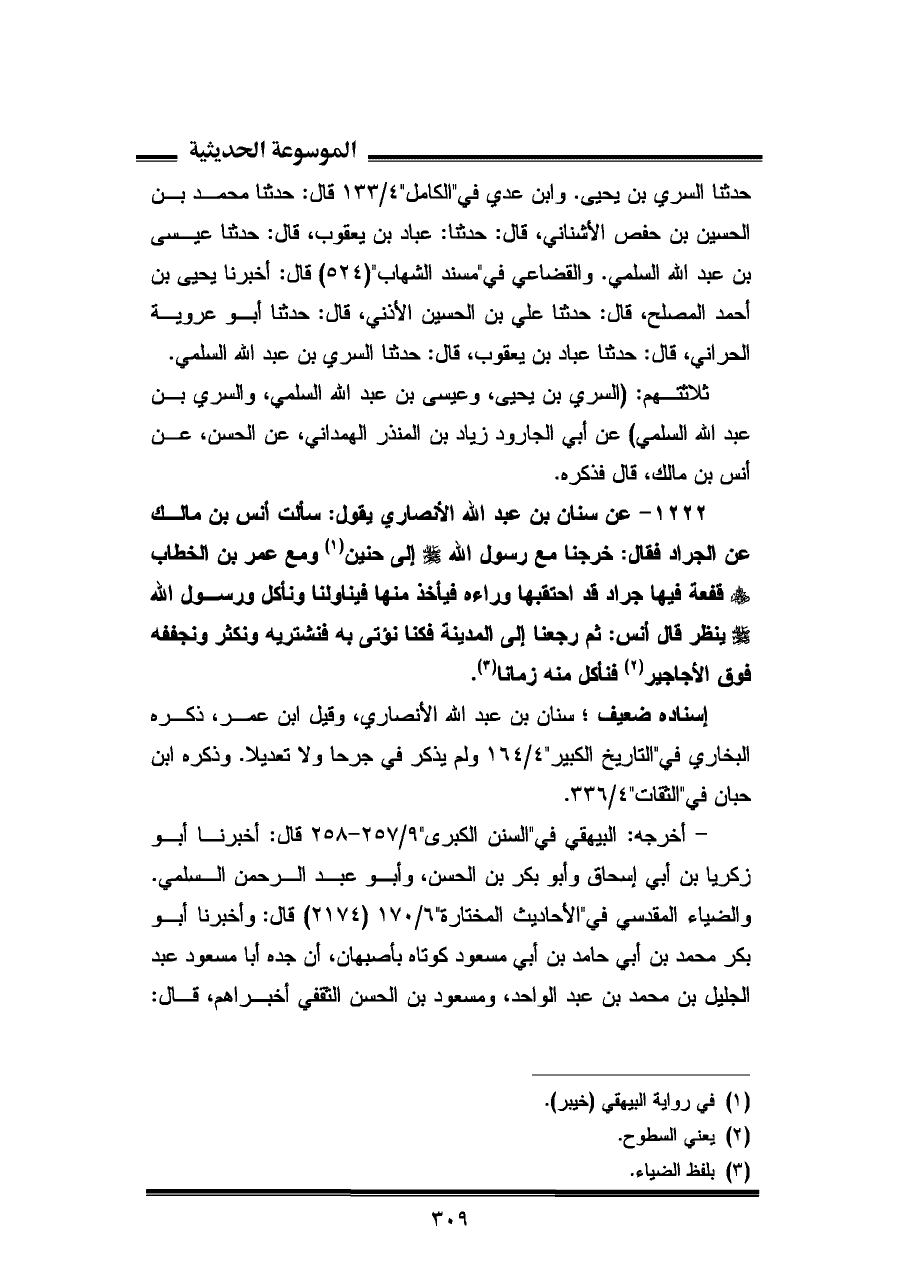 ١٢٢٢ - عن سنان بن جمد اللَّه الأنصاري يقول: سألت أنس بن مالك عن الجراد فقال: خرجنا مع رسول اللَّه -صلى اللَّه عليه وسلم- إلى حنين (¬١) ومع عمر بن الخطاب -رضى اللَّه عنهم- قفعة فيها جراد قد احتقبها وراءه فيأخذ منها فيناولنا ونأكل ورسول اللَّه -صلى اللَّه عليه وسلم- ينظر قال أنس: ثم رجعنا إلى المدينة فكنا نؤتى به فنشتريه ونكثر ونجففه فوق الأجاجير (¬٢) فنأكل منه زمانا (¬٣).