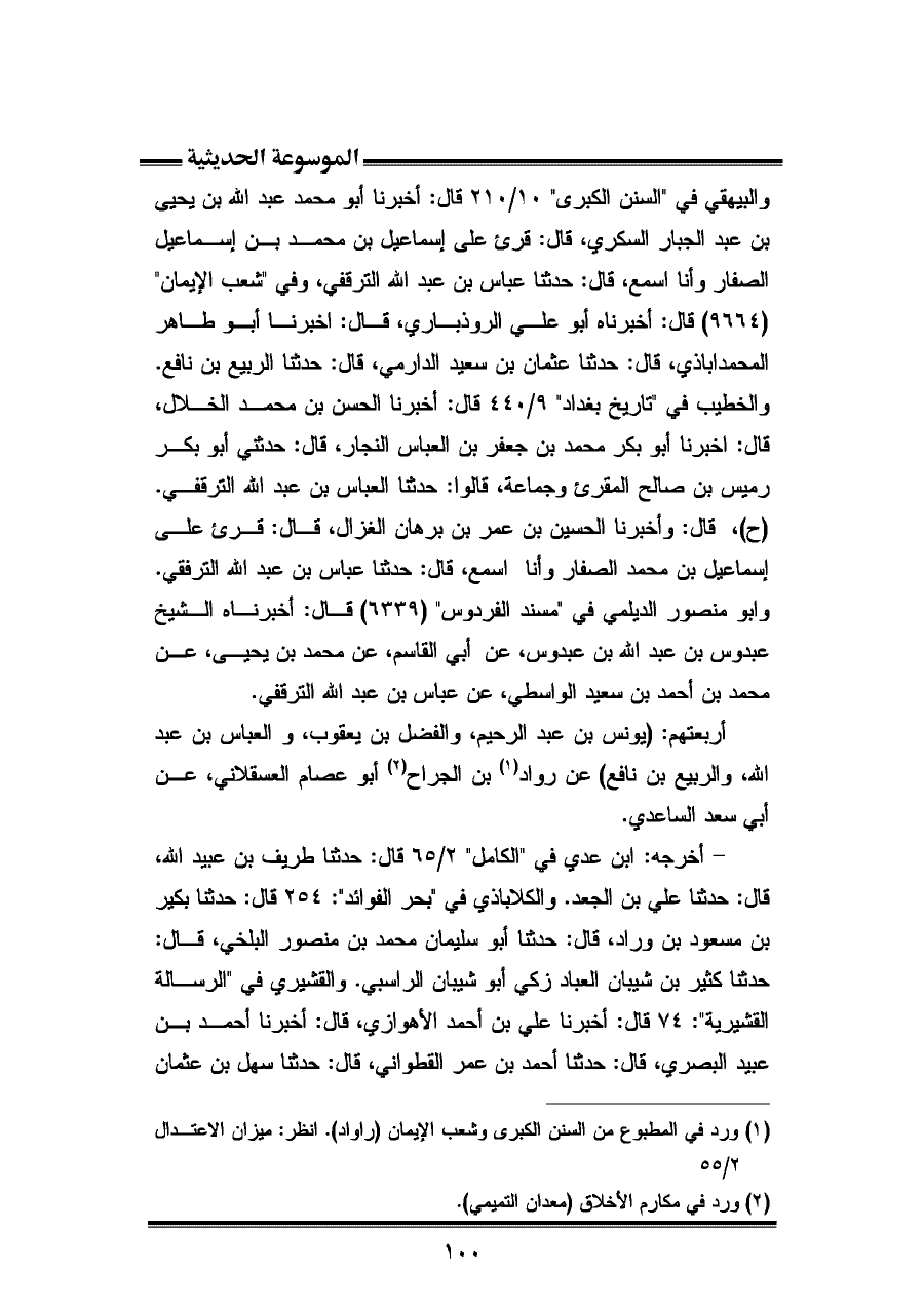 - أخرجه: ابن عدي في "الكامل" ٢/ ٦٥ قال: حدثنا طريف بن عبيد الله، قال: حدثنا علي بن الجعد. والكلاباذي في "بحر الفوائد": ٢٥٤ قال: حدثنا بكير بن مسعود بن وراد، قال: حدثنا أبو سليمان محمد بن منصور البلخي، قال: حدثنا كثير بن شيبان العباد زكي أبو شيبان الراسبي. والقشيري في "الرسالة القشيرية": ٧٤ قال: أخبرنا علي بن أحمد الأهوازي، قال: أخبرنا أحمد بن عبيد البصري، قال: حدثنا أحمد بن عمر القطواني، قال: حدثنا سهل بن عثمان