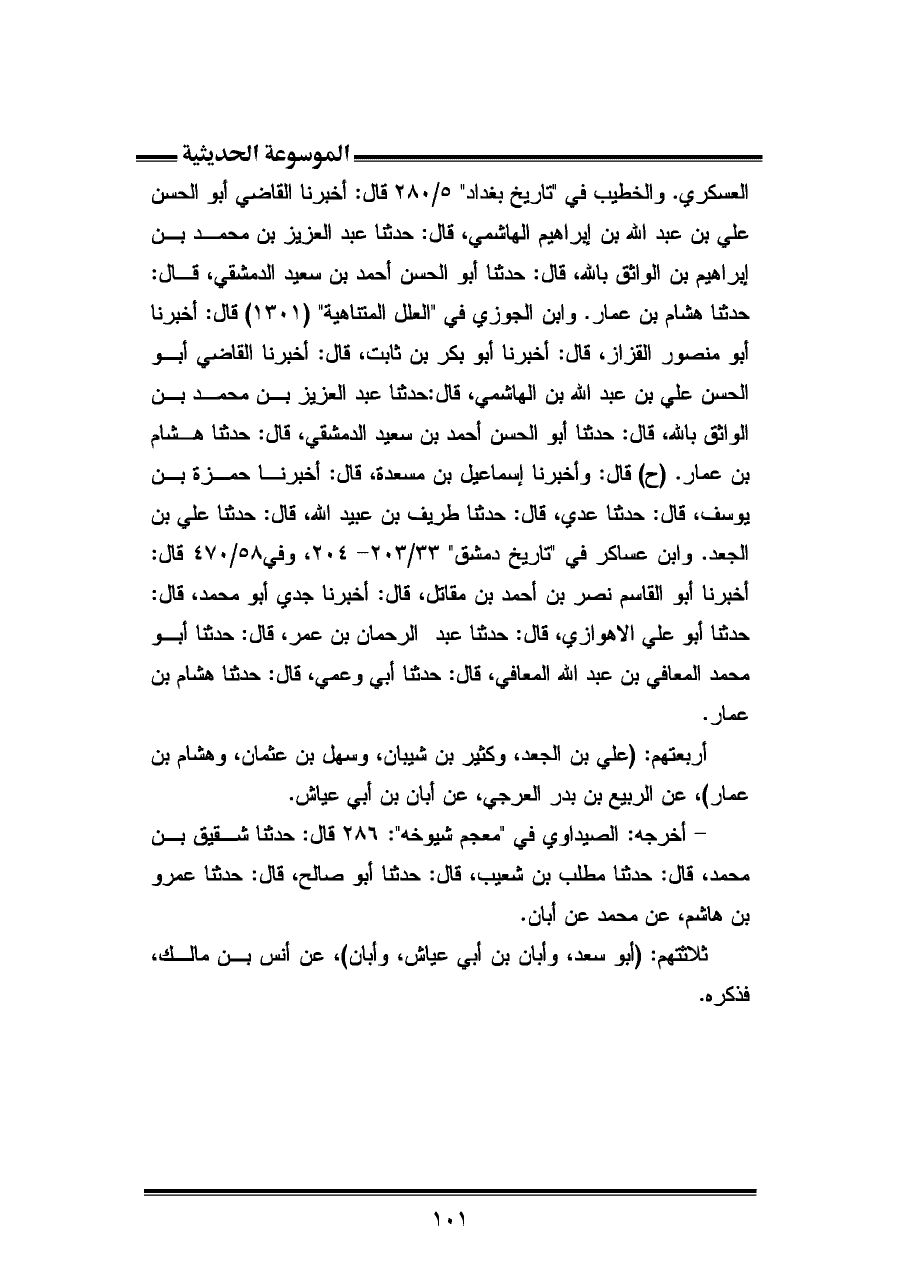 العسكري. والخطيب في "تاريخ بغداد" ٥/ ٢٨٠ قال: أخبرنا القاضي أبو الحسن علي بن عبد الله بن إبراهيم الهاشمي، قال: حدثنا عبد العزيز بن محمد بن إبراهيم بن الواثق بالله، قال: حدثنا أبو الحسن أحمد بن سعيد الدمشقي، قال: حدثنا هشام بن عمار. وابن الجوزي في "العلل المتناهية" (١٣٠١) قال: أخبرنا أبو منصور القزاز، قال: أخبرنا أبو بكر بن ثابت، قال: أخبرنا القاضي أبو الحسن علي بن عبد الله بن الهاشمي، قال: حدثنا عبد العزيز بن محمد بن الواثق بالله، قال: حدثنا أبو الحسن أحمد بن سعيد الدمشقي، قال: حدثنا هشام بن عمار. (ح) قال: وأخبرنا إسماعيل بن مسعدة، قال: أخبرنا حمزة بن يوسف، قال: حدثنا عدي، قال: حدثنا طريف بن عبيد الله، قال: حدثنا علي بن الجعد. وابن عساكر في "تاريخ دمشق" ٣٣/ ٢٠٣ - ٢٠٤، وفي ٥٨/ ٤٧٠ قال: أخبرنا أبو القاسم نصر بن أحمد بن مقاتل، قال: أخبرنا جدي أبو محمد، قال: حدثنا أبو علي الأهوازي، قال: حدثنا عبد الرحمان بن عمر، قال: حدثنا أبو محمد المعافي بن عبد الله المعافي، قال: حدثنا أبي وعمي، قال: حدثنا هشام بن عمار.
