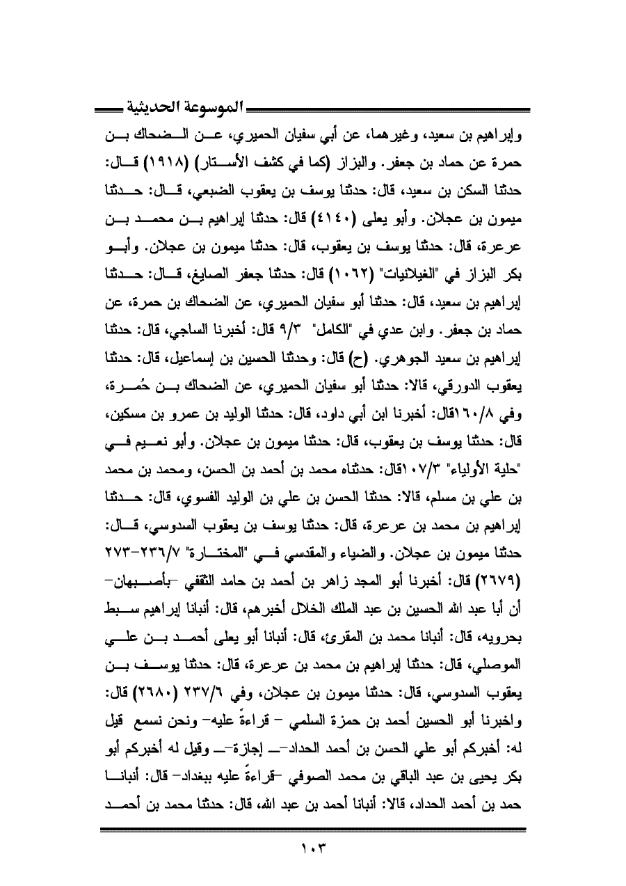 وإبراهيم بن سعيد، وغيرهما، عن أبي سفيان الحميري، عن الضحاك بن حمرة عن حماد بن جعفر. والبزاز (كما في كشف الأستار) (١٩١٨) قال: حدثنا السكن بن سعيد، قال: حدثنا يوسف بن يعقوب الضبعي، قال: حدثنا ميمون بن عجلان. وأبو يعلى (٤١٤٠) قال: حدثنا إبراهيم بن محمد بن عرعرة، قال: حدثنا يوسف بن يعقوب، قال: حدثنا ميمون بن عجلان. وأبو بكر البزاز في "الغيلانيات" (١٠٦٢) قال: حدثنا جعفر الصايغ، قال: حدثنا إبراهيم بن سعيد، قال: حدثنا أبو سفيان الحميري، عن الضحاك بن حمرة، عن حماد بن جعفر. وابن عدي في "الكامل" ٣/ ٩ قال: أخبرنا الساجي، قال: حدثنا إبراهيم بن سعيد الجوهري. (ح) قال: وحدثنا الحسين بن إسماعيل، قال: حدثنا يعقوب الدورقي، قالا: حدثنا أبو سفيان الحميري، عن الضحاك بن حُمرة، وفي ٨/ ١٦٠ قال: أخبرنا ابن أبي داود، قال: حدثنا الوليد بن عمرو بن مسكين، قال: حدثنا يوسف بن يعقوب، قال: حدثنا ميمون بن عجلان. وأبو نعيم في "حلية الأولياء" ٣/ ١٠٧ قال: حدثناه محمد بن أحمد بن الحسن، ومحمد بن محمد بن علي بن مسلم، قالا: حدثنا الحسن بن علي بن الوليد الفسوي، قال: حدثنا إبراهيم بن محمد بن عرعرة، قال: حدثنا يوسف بن يعقوب السدوسي، قال: حدثنا ميمون بن عجلان. والضياء والمقدسي في "المختارة" ٧/ ٢٣٦ - ٢٧٣ (٢٦٧٩) قال: أخبرنا أبو المجد زاهر بن أحمد بن حامد الثقفي -بأصبهان- أن أبا عبد الله الحسين بن عبد الملك الخلال أخبرهم، قال: أنبأنا إبراهيم سبط بحرويه، قال: أنبأنا محمد بن المقرئ، قال: أنبأنا أبو يعلى أحمد بن علي الموصلي، قال: حدثنا إبراهيم بن محمد بن عرعرة، قال: حدثنا يوسف بن يعقوب السدوسي، قال: حدثنا ميمون بن عجلان، وفي ٦/ ٢٣٧ (٢٦٨٠) قال: وأخبرنا أبو الحسين أحمد بن حمزة السلمي -قراءةً عليه- ونحن نسمع قيل له: أخبركم أبو علي الحسن بن أحمد الحداد -إجازة- وقيل له أخبركم أبو بكر يحيى بن عبد الباقي بن محمد الصوفي -قراءةً عليه ببغداد- قال: أنبأنا حمد بن أحمد الحداد، قالا: أنبأنا أحمد بن عبد الله، قال: حدثنا محمد بن أحمد