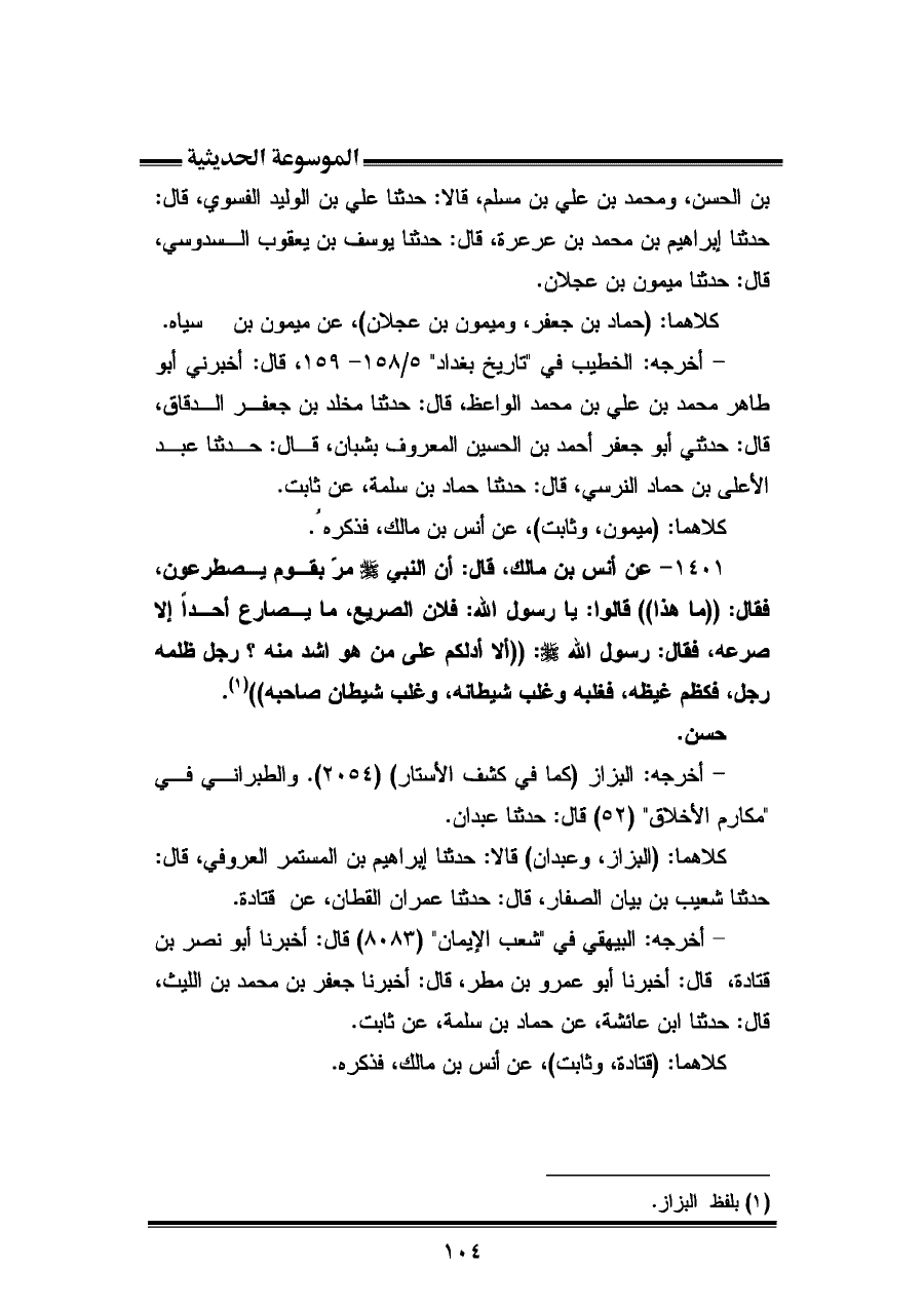 ١٤٠١ - عن أنس بن مالك، قال: أن النبي -صلى الله عليه وسلم- مرَّ بقوم يصطرعون، فقال: "ما هذا" قالوا: يا رسول الله: فلان الصريع، ما يصارع أحدًا إلا صرعه، فقال: رسول الله -صلى الله عليه وسلم-: "ألا أدلكم على من هو أشد منه؟ رجل ظلمه رجل، فكظم غيظه، فغلبه وغلب شيطانه، وغلب شيطان صاحبه" (¬١).