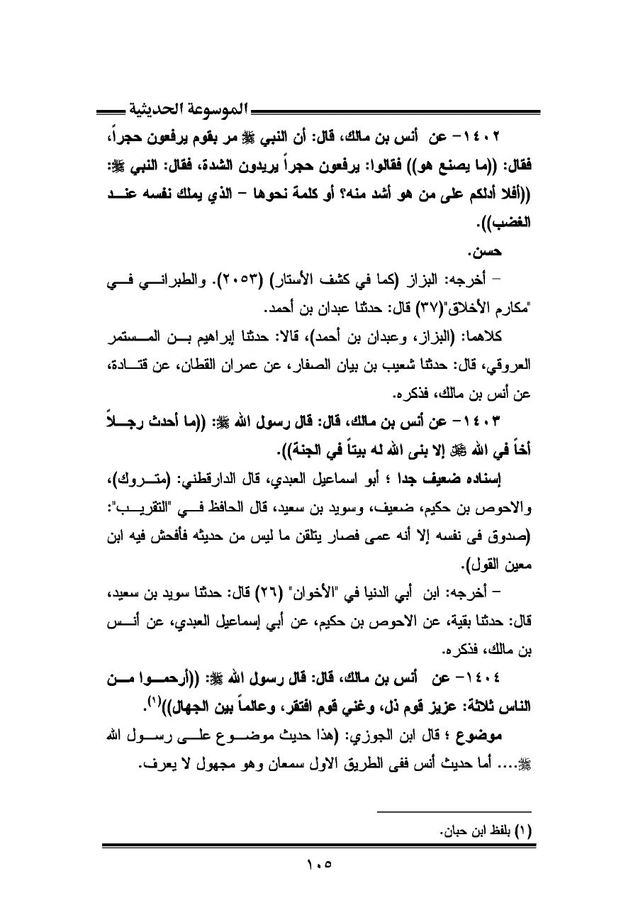 ١٤٠٤ - عن أنس بن مالك، قال: قال رسول الله -صلى الله عليه وسلم-: "أرحموا من الناس ثلاثة: عزيز قوم ذل، وغنى قوم افتقر، وعالمًا بين الجهال" (¬١).