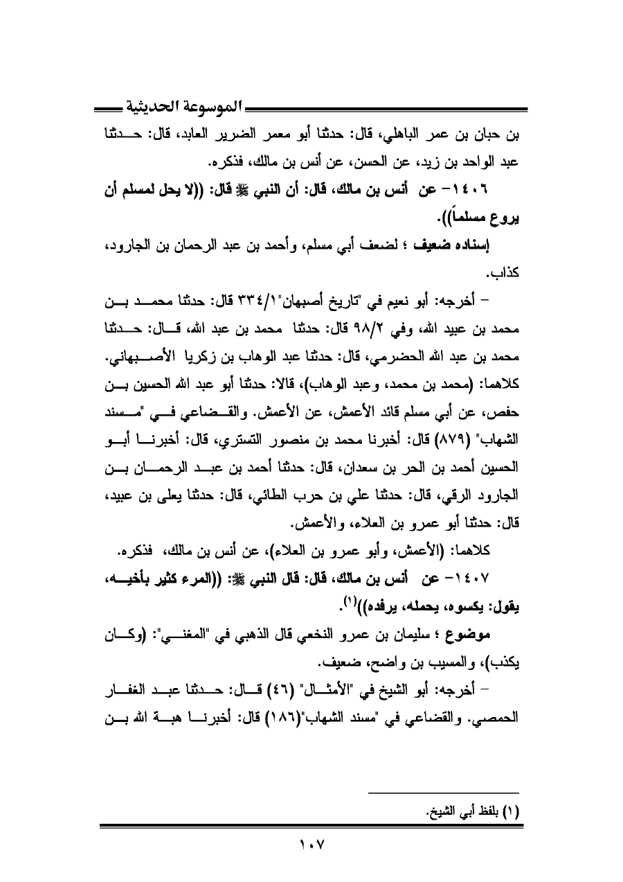 ١٤٠٦ - عن أنس بن مالك، قال: أن النبي -صلى الله عليه وسلم- قال: "لا يحل لمسلم أن يروع مسلمًا".