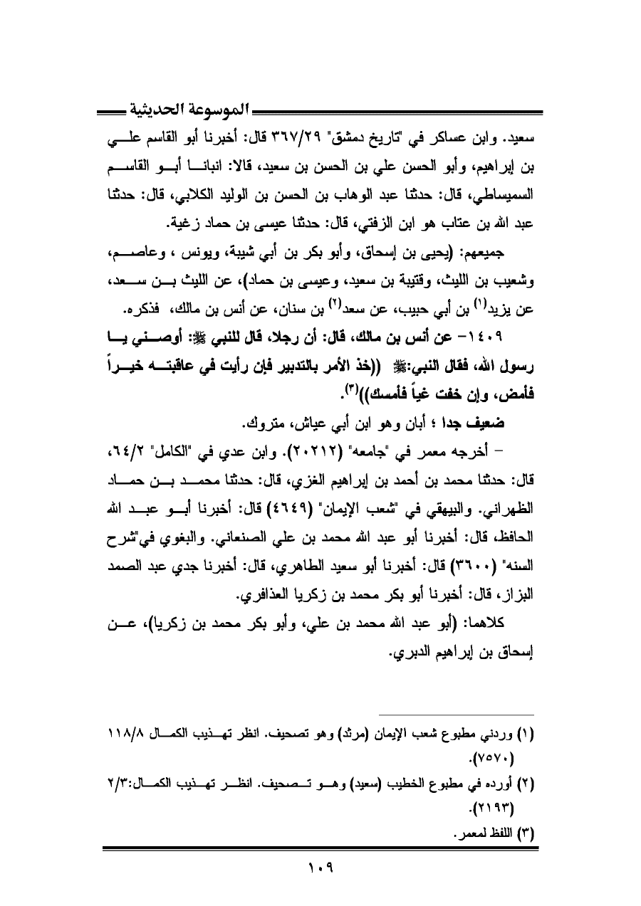 ١٤٠٩ - عن أنس بن مالك، قال: أن رجلا، قال للنبي -صلى الله عليه وسلم-: أوصنى يا رسول الله، فقال النبي -صلى الله عليه وسلم-: "خذ الأمر بالتدبير فإن رأيت فى عاقبته خيرًا فأمض، وإن خفت غيًا فأمسك" (¬٣).