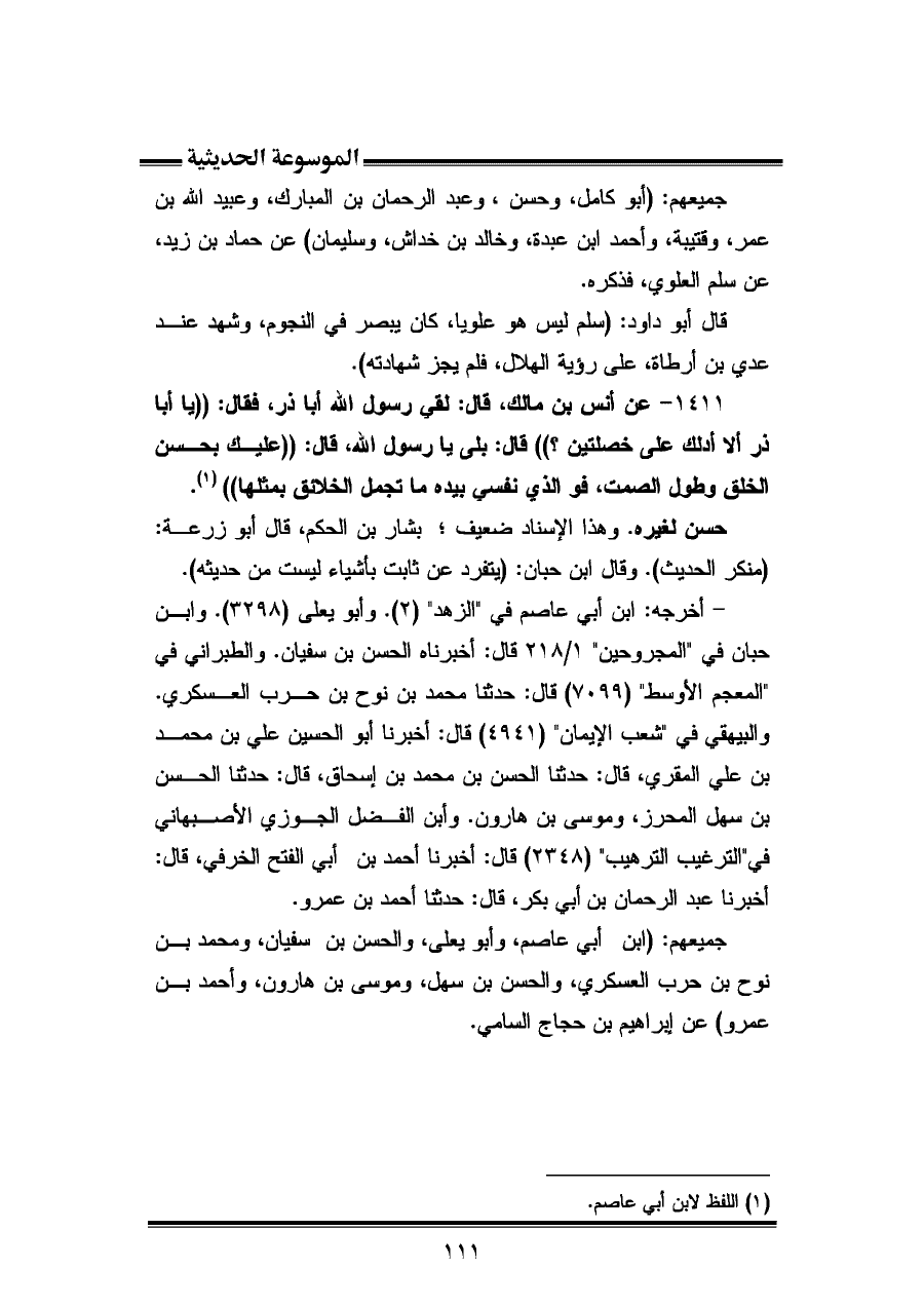 ١٤١١ - عن أنس بن مالك، قال: لقى رسول الله أبا ذر، فقال: "يا أبا ذر ألا أدلك على خصلتين؟ " قال: بلى يا رسول الله، قال: "عليك بحسن الخلق وطول الصمت، فوالذي نفسى بيده ما تجمل الخلائق بمثلها" (¬١).