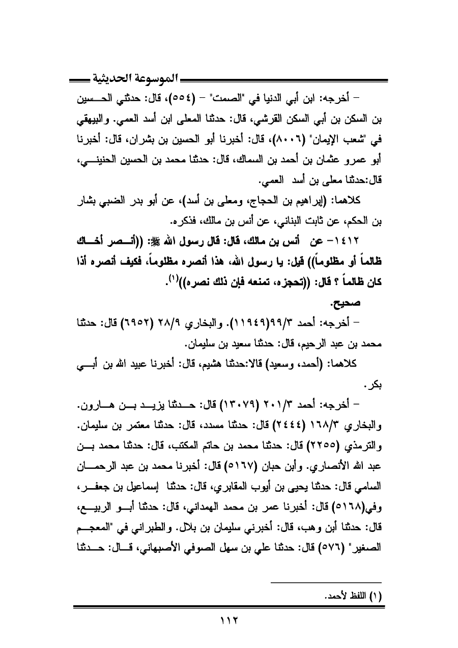 ١٤١٢ - عن أنس بن مالك، قال: قال رسول الله -صلى الله عليه وسلم-: "أنصر أخاك ظالمًا أو مظلومًا" قيل: يا رسول الله، هذا أنصره مظلومًا، فكيف أنصره أذا كان ظالمًا؟ قال: "تحجزه، تمنعه فإن ذلك نصره" (¬١).
