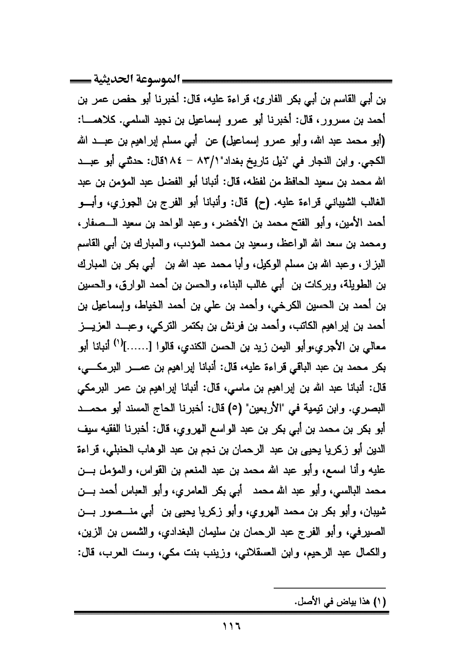 بن أبي القاسم بن أبي بكر الفارئ، قراءة عليه، قال: أخبرنا أبو حفص عمر بن أحمد بن مسرور، قال: أخبرنا أبو عمرو إسماعيل بن نجيد السلمي. كلاهما: (أبو محمد عبد الله، وأبو عمرو إسماعيل) عن أبي مسلم إبراهيم بن عبد الله الكجي. وابن النجار في "ذيل تاريخ بغداد" ١/ ٨٣ - ١٨٤ قال: حدثني أبو عبد الله محمد بن سعيد الحافظ من لفظه، قال: أنبأنا أبو الفضل عبد المؤمن بن عبد الغالب الشيباني قراءة عليه. (ح) قال: وأنبأنا أبو الفرج بن الجوزي، وأبو أحمد الأمين، وأبو الفتح محمد بن الأخضر، وعبد الواحد بن سعيد الصفار، ومحمد بن سعد الله الواعظ، وسعيد بن محمد المؤدب، والمبارك بن أبي القاسم البزاز، وعبد الله بن مسلم الوكيل، وأبا محمد عبد الله بن أبي بكر بن المبارك بن الطويلة، وبركات بن أبي غالب البناء، والحسن بن أحمد الوارق، والحسين بن أحمد بن الحسين الكرخي، وأحمد بن علي بن أحمد الخياط، وإسماعيل بن أحمد بن إبراهيم الكاتب، وأحمد بن فرنش بن بكتمر التركي، وعبد العزيز معالي بن الأجري، وأبو اليمن زيد بن الحسن الكندي، قالوا [ ....... ] (¬١) أنبأنا أبو بكر محمد بن عبد الباقي قراءة عليه، قال: أنبأنا إبراهيم بن عمر البرمكي، قال: أنبأنا عبد الله بن إبراهيم بن ماسي، قال: أنبأنا إبراهيم بن عمر البرمكي البصرى. وابن تيمية في "الأربعين" (٥) قال: أخبرنا الحاج المسند أبو محمد أبو بكر بن محمد بن أبي بكر بن عبد الواسع الهروي، قال: أخبرنا الفقيه سيف الدين أبو زكريا يحيى بن عبد الرحمان بن نجم بن عبد الوهاب الحنبلي، قراءة عليه وأنا أسمع، وأبو عبد الله محمد بن عبد المنعم بن القواس، والمؤمل بن محمد البالسي، وأبو عبد الله محمد أبي بكر العامري، وأبو العباس أحمد بن شيبان، وأبو بكر بن محمد الهروي، وأبو زكريا يحيى بن أبي منصور بن الصيرفي، وأبو الفرج عبد الرحمان بن سليمان البغدادي، والشمس بن الزين، والكمال عبد الرحيم، وابن العسقلاني، وزينب بنت مكي، وست العرب، قال: