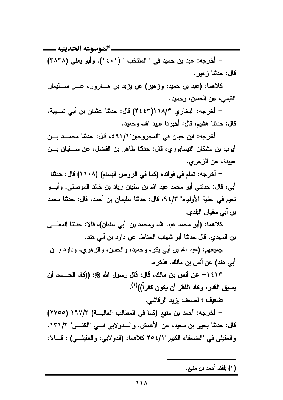 ١٤١٣ - عن أنس بن مالك، قال: قال رسول الله -صلى الله عليه وسلم-: "كاد الحسد أن يسبق القدر، وكاد الفقر أن يكون كفرًا" (¬١).