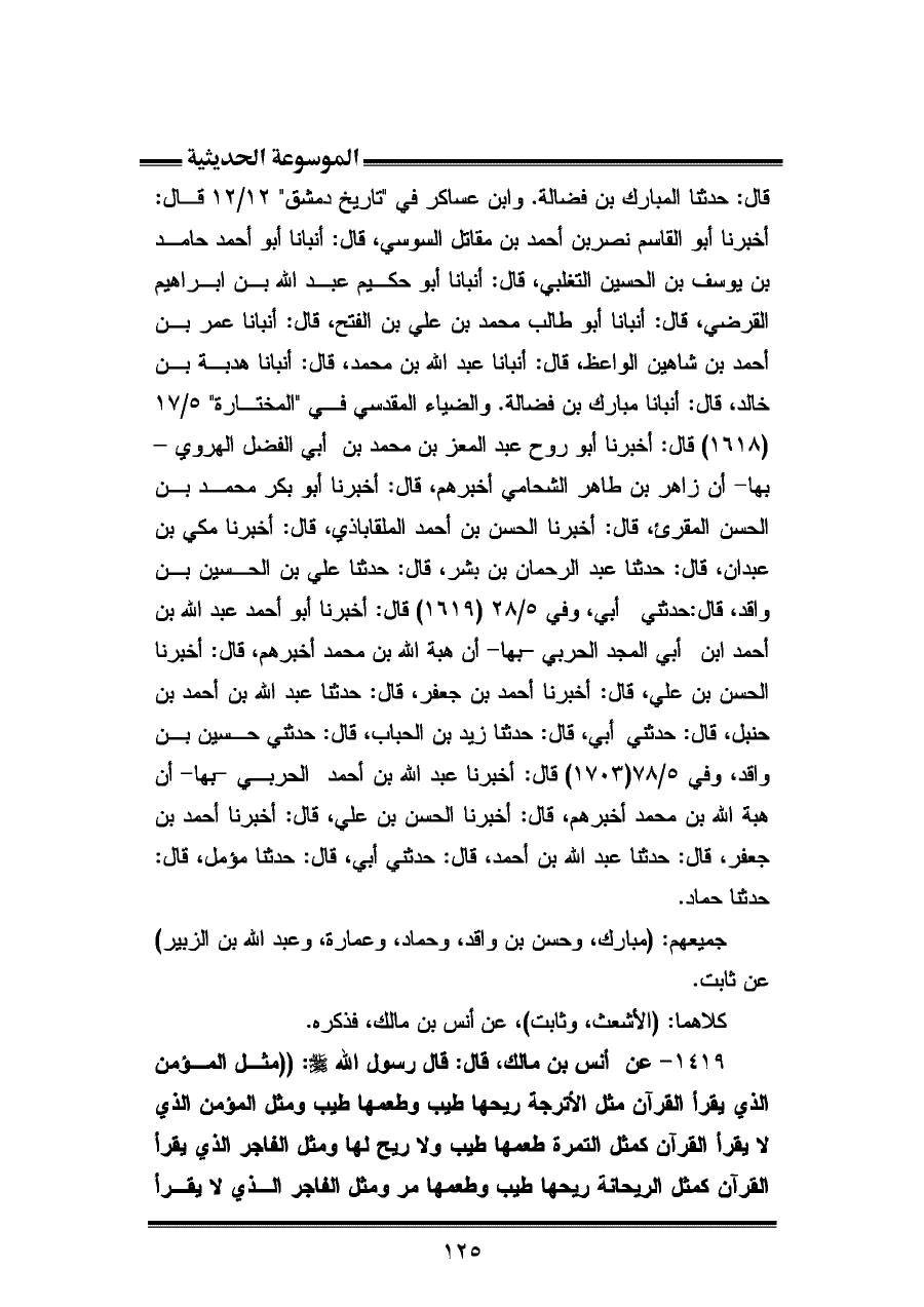 قال: حدثنا المبارك بن فضالة. وابن عساكر في "تاريخ دمشق" ١٢/ ١٢ قال: أخبرنا أبو القاسم نصر بن أحمد بن مقاتل السوسي، قال: أنبأنا أبو أحمد حامد بن يوسف بن الحسين التغلبي، قال: أنبأنا أبو حكيم عبد الله بن إبراهيم القرضي، قال: أنبأنا أبو طالب محمد بن علي بن الفتح، قال: أنبأنا عمر بن أحمد بن شاهين الواعظ، قال: أنبأنا عبد الله بن محمد، قال: أنبأنا هدبة بن خالد، قال: أنبأنا مبارك بن فضالة. والضياء المقدسي في "المختارة" ٥/ ١٧ (١٦١٨) قال: أخبرنا أبو روح عبد المعز بن محمد بن أبي الفضل الهروي -بها- أن زاهر بن طاهر الشحامي أخبرهم، قال: أخبرنا أبو بكر محمد بن الحسن المقرئ، قال: أخبرنا الحسن بن أحمد الملقاباذي، قال: أخبرنا مكي بن عبدان، قال: حدثنا عبد الرحمان بن بشر، قال: حدثنا علي بن الحسين بن واقد، قال: حدثني أبي، وفي ٥/ ٢٨ (١٦١٩) قال: أخبرنا أبو أحمد عبد الله بن أحمد ابن أبي المجد الحربي -بها- أن هبة الله بن محمد أخبرهم، قال: أخبرنا الحسن بن علي، قال: أخبرنا أحمد بن جعفر، قال: حدثنا عبد الله بن أحمد بن حنبل، قال: حدثني أبي، قال: حدثنا زيد بن الحباب، قال: حدثني حسين بن واقد، وفي ٥/ ٧٨ (١٧٠٣) قال: أخبرنا عبد الله بن أحمد الحربي -بها- أن هبة الله بن محمد أخبرهم، قال: أخبرنا الحسن بن علي، قال: أخبرنا أحمد بن جعفر، قال: حدثنا عبد الله بن أحمد، قال: حدثني أبي، قال: حدثنا مؤمل، قال: حدثنا حماد.