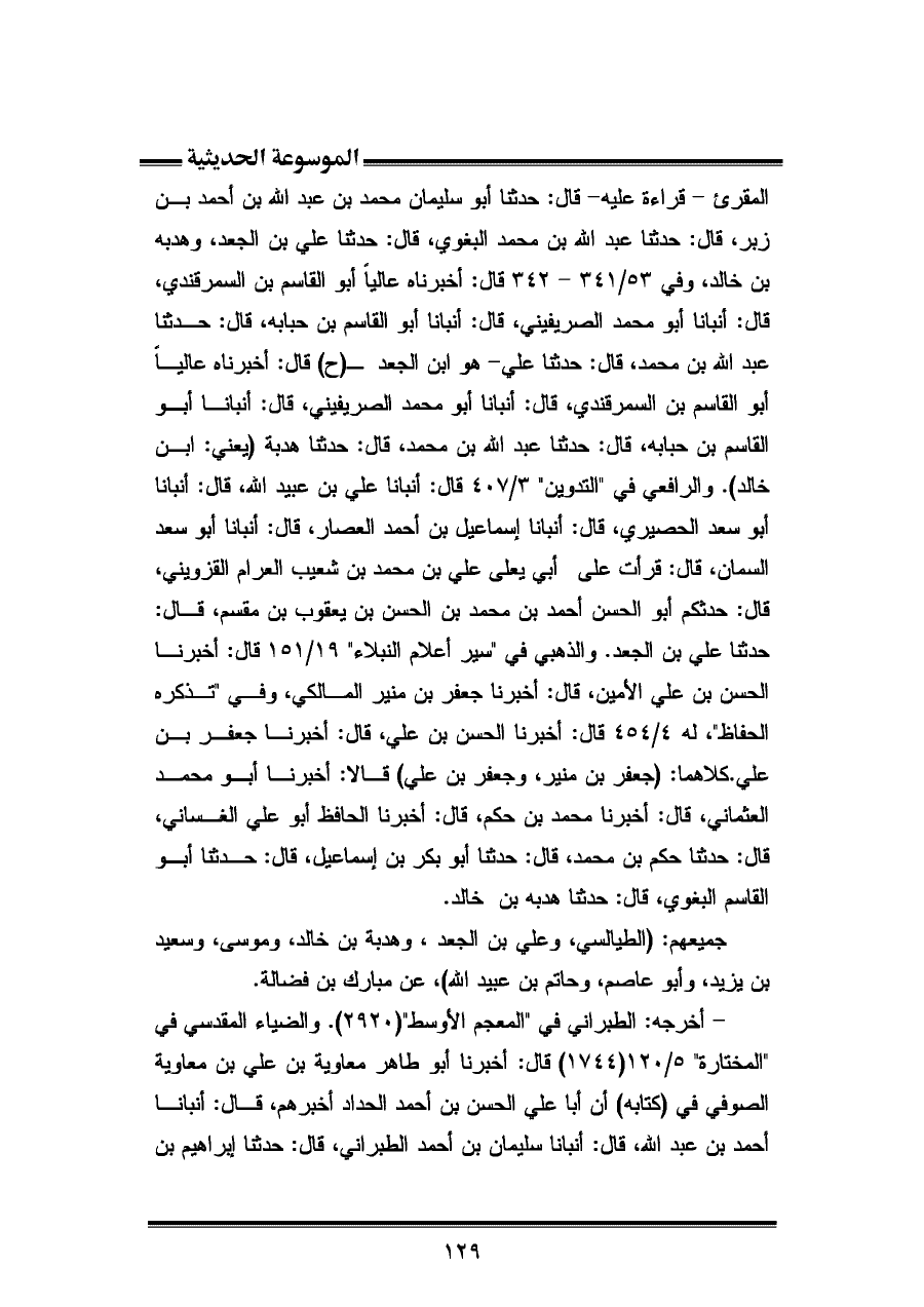 المقرئ -قراءة عليه- قال: حدثنا أبو سليمان محمد بن عبد الله بن أحمد بن زبر، قال: حدثنا عبد الله بن محمد البغوي، قال: حدثنا على بن الجعد، وهدبه بن خالد، وفي ٥٣/ ٣٤١ - ٣٤٢ قال: أخبرناه عاليًا أبو القاسم بن السمرقندي، قال: أنبأنا أبو محمد الصريفيني، قال: أنبأنا أبو القاسم بن حبابه، قال: حدثنا عبد الله بن محمد، قال: حدثنا علي -هو ابن الجعد- (ح) قال: أخبرناه عاليًا أبو القاسم بن السمرقندي، قال: أنبأنا أبو محمد الصريفيني، قال: أنبأنا أبو القاسم بن حبابه، قال: حدثنا عبد الله بن محمد، قال: حدثنا هدبة (يعني: ابن خالد). والرافعي في "التدوين" ٣/ ٤٠٧ قال: أنبأنا علي بن عبيد الله، قال: أنبأنا أبو سعد الحصيري، قال: أنبأنا إسماعيل بن أحمد العصار، قال: أنبأنا أبو سعد السمان، قال: قرأت على أبي يعلى علي بن محمد بن شعيب العرام القزويني، قال: حدثكم أبو الحسن أحمد بن محمد بن الحسن بن يعقوب بن مقسم، قال: حدثنا علي بن الجعد. والذهبي في "سير أعلام النبلاء" ١٩/ ١٥١ قال: أخبرنا الحسن بن علي الأمين، قال: أخبرنا جعفر بن منير المالكي، وفي "تذكرة الحفاظ"، له ٤/ ٤٥٤ قال: أخبرنا الحسن بن علي، قال: أخبرنا جعفر بن علي. كلاهما: (جعفر بن منير، وجعفر بن علي) قالا: أخبرنا أبو محمد العثماني، قال: أخبرنا محمد بن حكم، قال: أخبرنا الحافظ أبو علي الغساني، قال: حدثنا حكم بن محمد، قال: حدثنا أبو بكر بن إسماعيل، قال: حدثنا أبو القاسم البغوي، قال: حدثنا هدبة بن خالد.