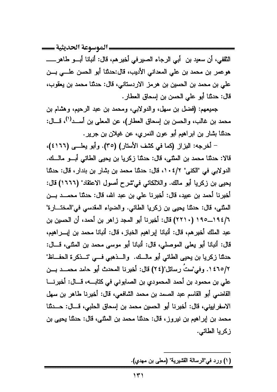 - أخرجه: البزاز (كما في كشف الأستار) (٣٥). وأبو يعلى (٤١٦٦)، قالا: حدثنا محمد بن المثنى، قال: حدثنا زكريا بن يحيى الطائي أبو مالك. الدولابي في "الكنى" ٢/ ١٠٤، قال: حدثنا محمد بن بشار بن بندار، قال: حدثنا يحيى بن زكريا أبو مالك. واللالكائي في "شرح أصول الاعتقاد" (١٦٦٦) قال: أخبرنا أحمد بن عبيد، قال: أخبرنا علي بن عبد الله، قال: حدثنا محمد بن المثني، قال: حدثنا يحيى بن زكريا الطائي. والضياء المقدسي في "المختارة" ٦/ ١٩٤ - ١٩٥ (٢٢١٠) قال: أخبرنا أبو المجد زاهر بن أحمد، أن الحسين بن عبد الملك أخبرهم، قال: أنبأنا إبراهيم الخباز، قال: أنبأنا محمد بن إبراهيم، قال: أنبأنا أبو يعلى الموصلي، قال: أنبأنا أبو موسى محمد بن المثنى، قال: حدثنا زكريا بن يحيى الطائي أبو مالك. والذهبي في "تذكرة الحفاظ" ٢/ ١٤٦٥. وفي "ستُ رسائل" (٢٤) قال: أخبرنا المحدث أبو حامد محمد بن علي بن محمود بن أحمد المحمودي بن الصابوني في كتابه، قال: أخبرنا القاضي أبو القاسم عبد الصمد بن محمد الشافعي، قال: أخبرنا طاهر بن سهل الإسفراييني، قال: أخبرنا أبو الحسين محمد بن إسحاق الحلبي، قال: حدثنا محمد بن إبراهيم بن نيروز، قال: حدثنا محمد بن المثنى، قال: حدثنا يحيى بن زكريا الطائي.
