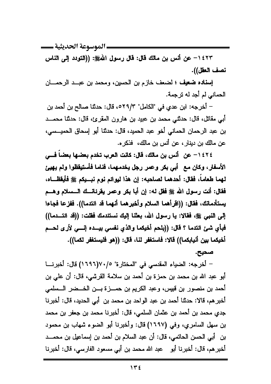 ١٤٢٣ - عن أنس بن مالك قال: قال رسول الله -صلى الله عليه وسلم-: "التودد إلى الناس نصف العقل".
