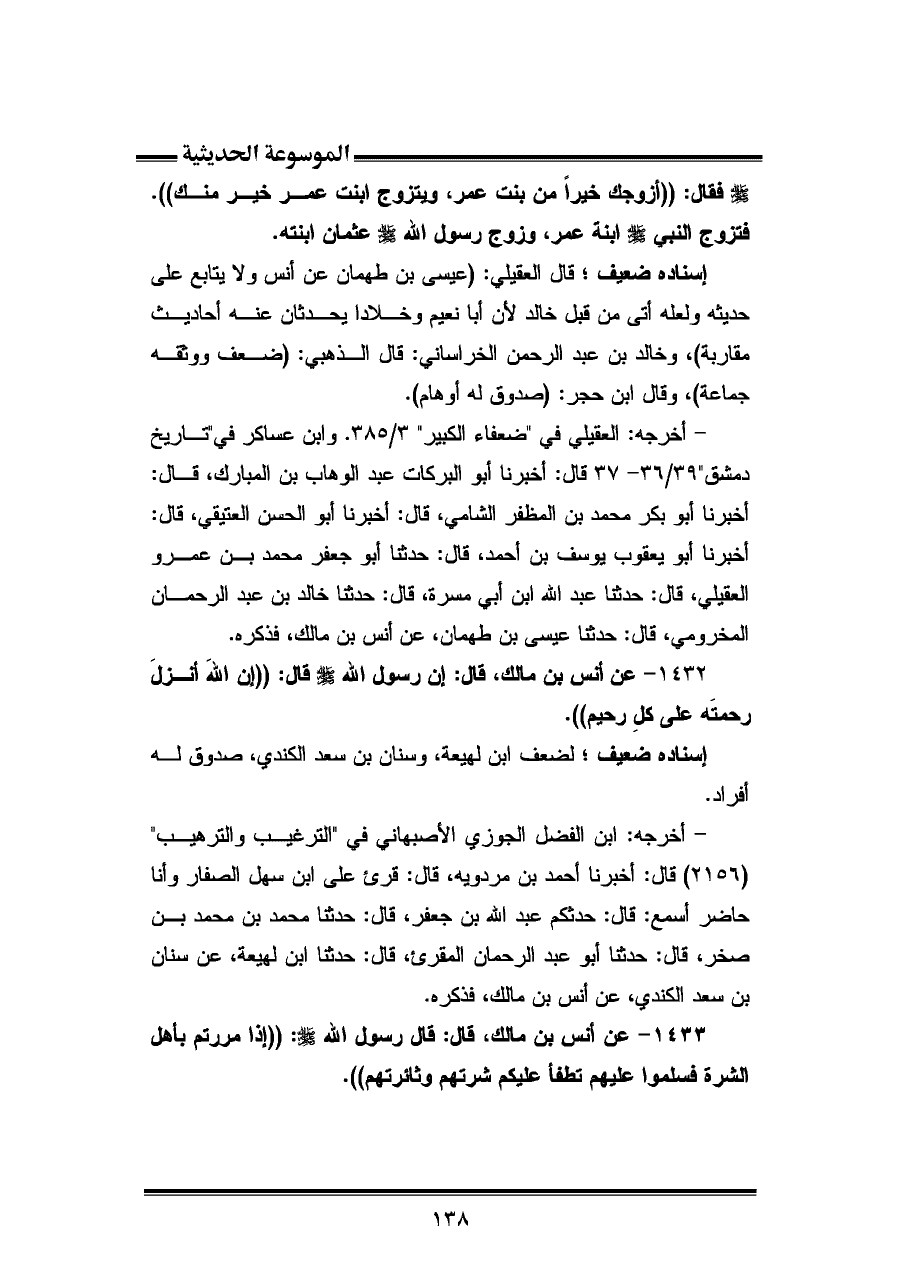 - أخرجه: العقيلي في "ضعفاء الكبير" ٣/ ٣٨٥. وابن عساكر في "تاريخ دمشق " ٣٩/ ٣٦ - ٣٧ قال: أخبرنا أبو البركات عبد الوهاب بن المبارك، قال: أخبرنا أبو بكر محمد بن المظفر الشامي، قال: أخبرنا أبو الحسن العتيقى، قال: أخبرنا أبو يعقوب يوسف بن أحمد، قال: حدثنا أبو جعفر محمد بن عمرو العقيلي، قال: حدثنا عبد الله ابن أبي مسرة، قال: حدثنا خالد بن عبد الرحمان المخرومي، قال: حدثنا عيسى بن طهمان، عن أنس بن مالك، فذكره.