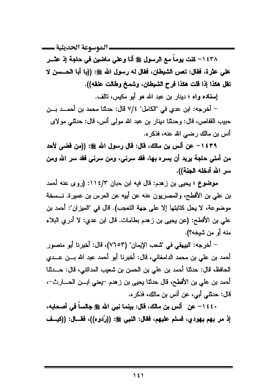 ١٤٣٩ - عن أنس بن مالك، قال: قال رسول الله - صلى الله عليه وسلم -: "من قضى لأحد من أمتى حاجة يريد أن يسره بها، فقد سرنى، ومن سرنى فقد سر الله ومن سر الله أدخله الجنة".