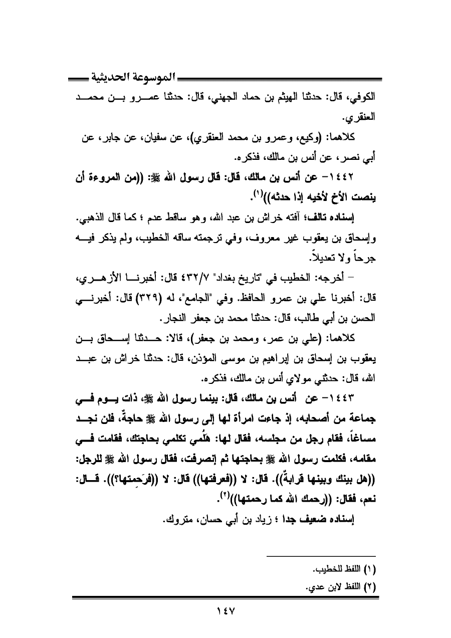 ١٤٤٢ - عن أنس بن مالك، قال: قال رسول الله - صلى الله عليه وسلم -: "من المروءة أن ينصت الأخ لأخيه إذا حدثه" (¬١).