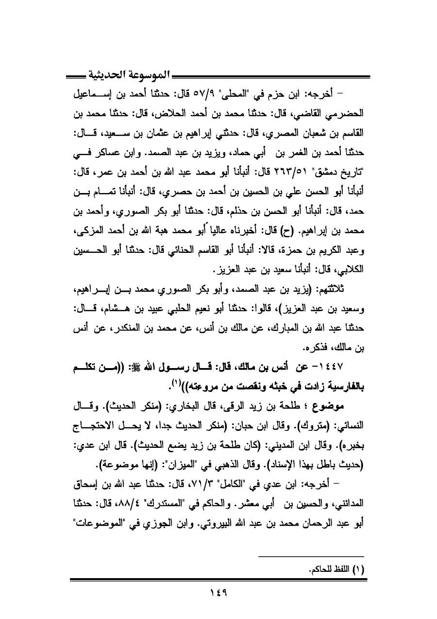 ١٤٤٧ - عن أنس بن مالك، قال: قال رسول الله - صلى الله عليه وسلم -: "من تكلم بالفارسية زادت في خبثه ونتصت من مروءته" (¬١).