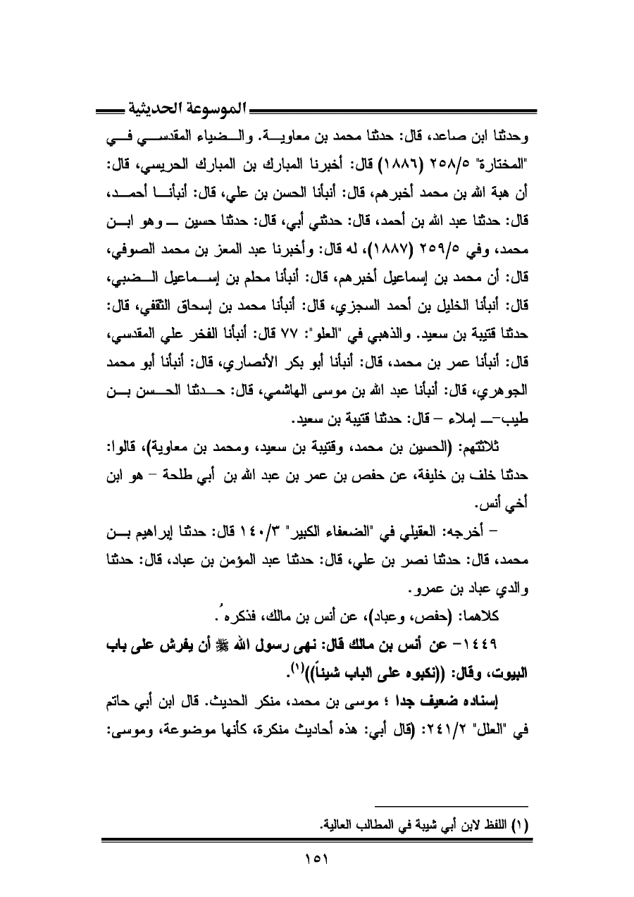 وحدثنا ابن صاعد، قال: حدثنا محمد بن معاوية. والضياء المقدسي في "المختارة" ٥/ ٢٥٨ (١٨٨٦) قال: أخبرنا المبارك بن المبارك الحريسي، قال: أن هبة الله بن محمد أخبرهم، قال: أنبأنا الحسن بن على، قال: أنبأنا أحمد، قال: حدثنا عبد الله بن أحمد، قال: حدثني أبي، قال: حدثنا حسين - وهو ابن محمد، وفي ٥/ ٢٥٩ (١٨٨٧)، له قال: وأخبرنا عبد المعز بن محمد الصوفي، قال: أن محمد بن إسماعيل أخبرهم، قال: أنبأنا محلم بن إسماعيل الضبي، قال: أنبأنا الخليل بن أحمد السجزي، قال: أنبأنا محمد بن إسحاق الثقفي، قال: حدثنا قتيبة بن سعيد. والذهبي في "العلو": ٧٧ قال: أنبأنا الفخر علي المقدسي، قال: أنبأنا عمر بن محمد، قال: أنبأنا أبو بكر الأنصاري، قال: أنبأنا أبو محمد الجوهرى، قال: أنبأنا عبد الله بن موسى الهاشمي، قال: حدثنا الحسن بن طيب - إملاء - قال: حدثنا قتيبة بن سعيد.
