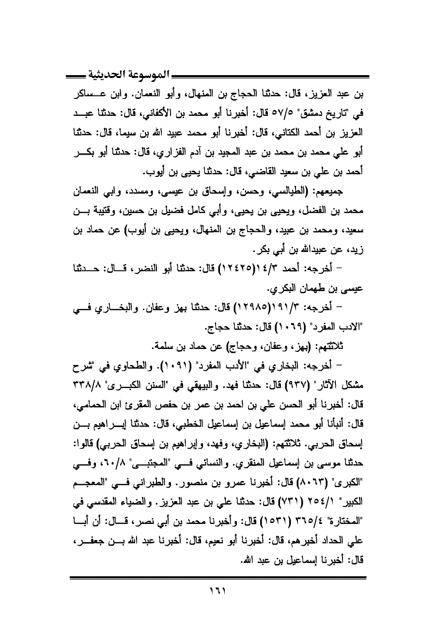جميعهم: (الطيالسي، وحسن، وإسحاق بن عيسى، ومسدد، وأبي النعمان محمد بن الفضل، ويحيى بن يحيى، وأبي كامل فضيل بن حسين، وقتيبة بن سعيد، ومحمد بن عبيد، والحجاج بن المنهال، ويحيى بن أيوب) عن حماد بن زيد، عن عبيد الله بن أبي بكر.