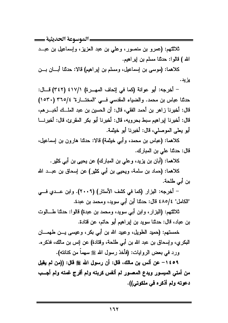 ١٤٥٩ - عن أنس بن مالك، قال: ان رسول الله - صلى الله عليه وسلم - قال: "من لم يقبل من أمتى الميسور ويدع المعسور لم أنفس كربته ولم أفرج غمته ولم أجب دعوته ولم أذكره في ملكوتى".
