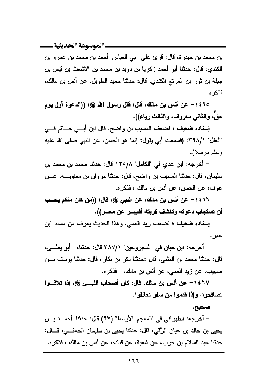 ١٤٦٧ - عن أنس بن مالك، قال: كان أصحاب النبيِّ - صلى الله عليه وسلم -، إذا تلاقوا تصافحوا، وإذا قدموا من سفر تعانقوا.