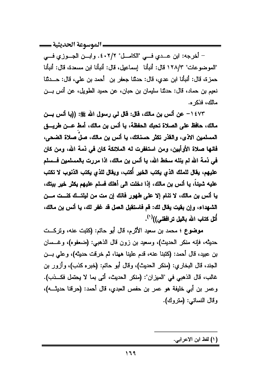 ١٤٧٣ - عن أنس بن مالك، قال: قال لى رسول الله - صلى الله عليه وسلم -: "يا أنس بن مالك، حافظ على الصلاة تحبك الحفظة، يا أنس بن مالك، أمط عن طريق المسلمين الأذى، والقذر تكثر حسناتك، يا أنس بن مالك، صلِّ صلاة الضحى، فإنها صلاة الأوابين، ومن استغفرت له الملائكة كان في ذمة الله، ومن كان في ذمة الله لم ينله سخط الله، يا أنس بن مالك، إذا مررت بالمسلمين فسلم عليهم، يقال للملك الذي يكتب الخير أُكتب، ويقال للذي يكتب الذنوب لا تكتب عليه شيئًا، يا أنس بن مالك، إذا دخلت إلى أهلك فسلم عليهم يكثر خير بيتك، يا أنس بن مالك، لا تنام إلا على طهور فإنك إن مت من ليلتك كنت من الشهداء، وإن بقيت يقال لك: قم فاستقبل العمل قد غفر لك، يا أنس بن مالك، أتل كتاب الله باليل ترافقنى" (¬١).