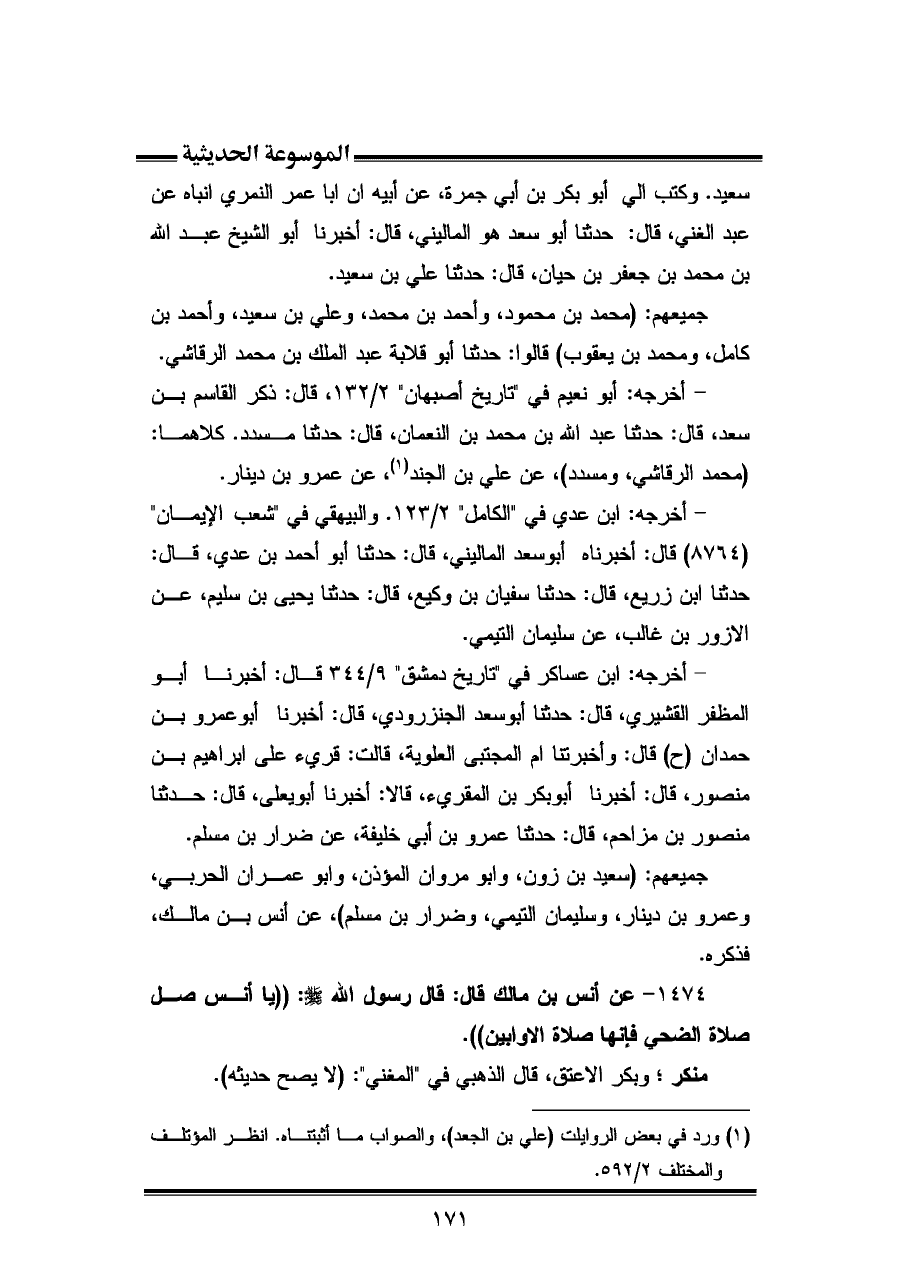 سعيد. وكتب إلي أبو بكر بن أبي جمرة، عن أبيه أن أبا عمر النمري انباه عن عبد الغنى، قال: حدثنا أبو سعد هو الماليني، قال: أخبرنا أبو الشيخ عبد الله بن محمد بن جعفر بن حيان، قال: حدثنا على بن سعيد.