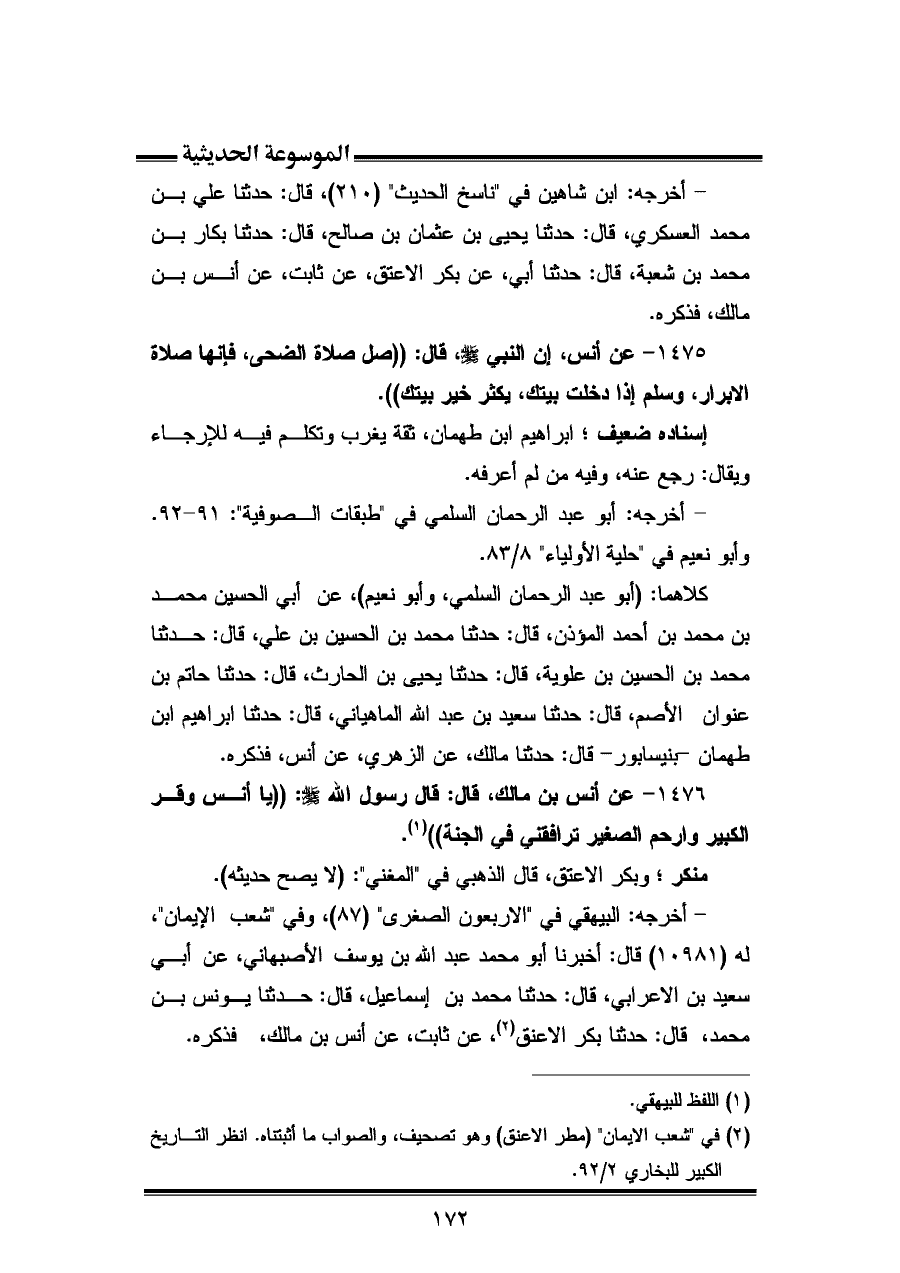 ١٤٧٥ - عن أنس، إن النبيَّ - صلى الله عليه وسلم -، قال: "صل صلاة الضحى، فإنها صلاة الأبرار، وسلم إذا دخلت بيتك، يكثر خير بيتك".
