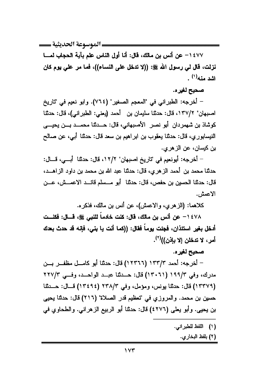 ١٤٧٧ - عن أنس بن مالك، قال: أنا اول الناس علم بآية الحجاب لما نزلت، قال لى رسول الله - صلى الله عليه وسلم -: "لا تدخل على النساء"، فما مر على يوم كان أشد منه (¬١).