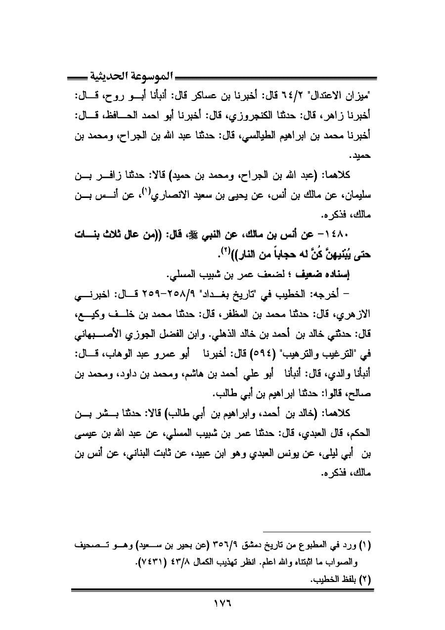 ١٤٨٠ - عن أنس بن مالك، عن النبي - صلى الله عليه وسلم -، قال: "من عال ثلاث بنات حتى يُبْنيهنَّ كُنَّ له حجابًا من النار" (¬٢).