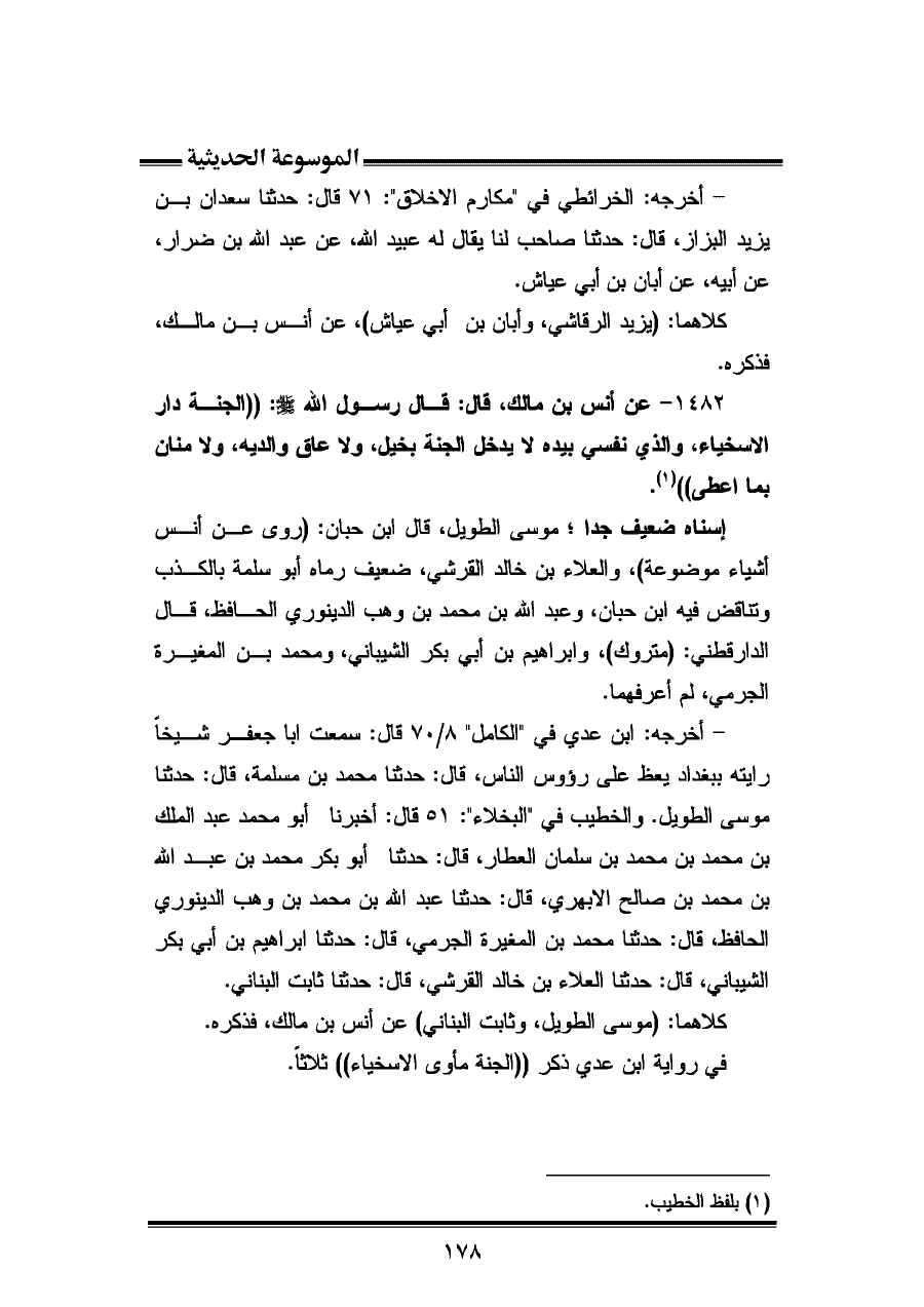 ١٤٨٢ - عن أنس بن مالك، قال: قال رسول الله - صلى الله عليه وسلم -: "الجنة دار الأسخياء، والذي نفسي بيده لا يدخل الجنة بخيل، ولا عاق والديه، ولا منان بما أعطى" (¬١).
