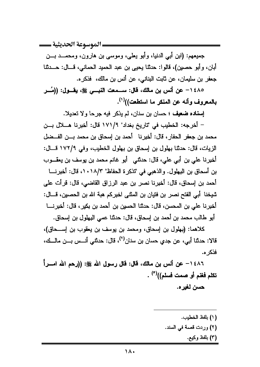 ١٤٨٥ - عن أنس بن مالك، قال: سمعت النبيَّ - صلى الله عليه وسلم -، يقول: "مُر بالمعروف وأنه عن المنكر ما استطعت" (¬١).