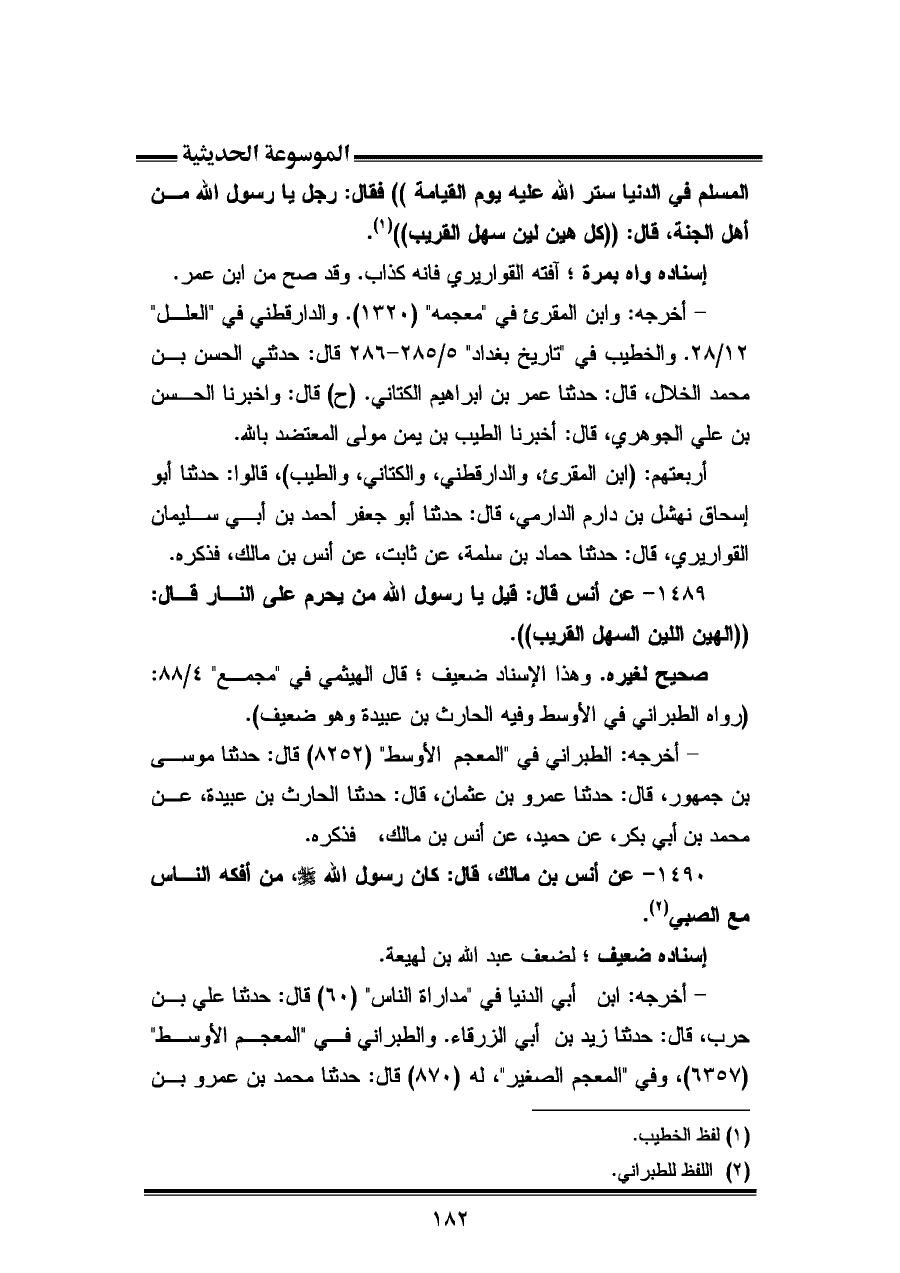 ١٤٨٩ - عن أنس قال: قيل يا رسول الله من يحرم على النار قال: "الهين اللين السهل القريب".