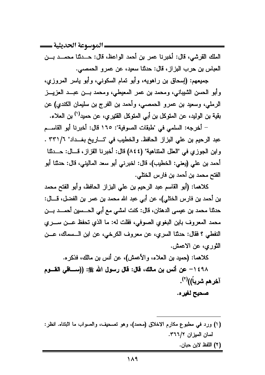 ١٤٩٨ - عن أنس بن مالك، قال: قال رسول الله - صلى الله عليه وسلم -: "ساقى القوم آخرهم شربًا" (¬٢).