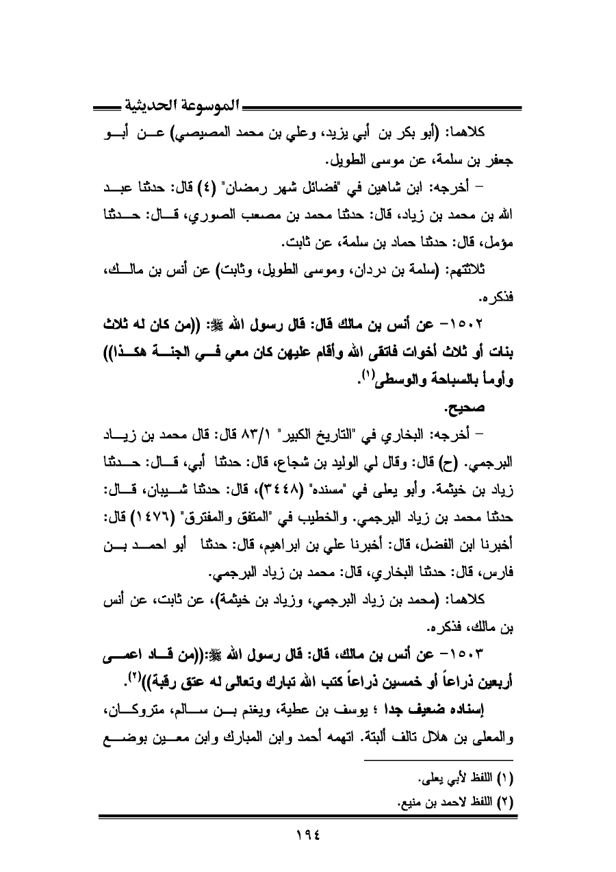 ١٥٠٣ - عن أنس بن مالك، قال: قال رسول الله - صلى الله عليه وسلم -: "من قاد أعمى أربعين ذراعًا أو خمسين ذراعًا كتب الله تبارك وتعالى له عتق رقبة" (¬٢).