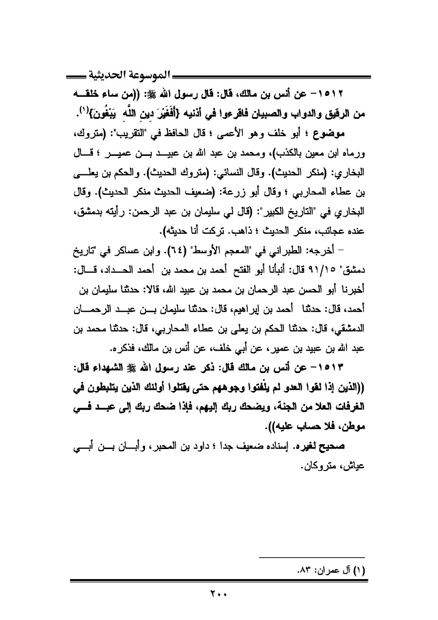 ١٥١٢ - عن أنس بن مالك، قال: قال رسول الله - صلى الله عليه وسلم -: "من ساء خلقه من الرقيق والدواب والصبيان فاقرءوا في أذنيه {أَفَغَيْرَ دِينِ اللَّهِ يَبْغُونَ} (¬١).