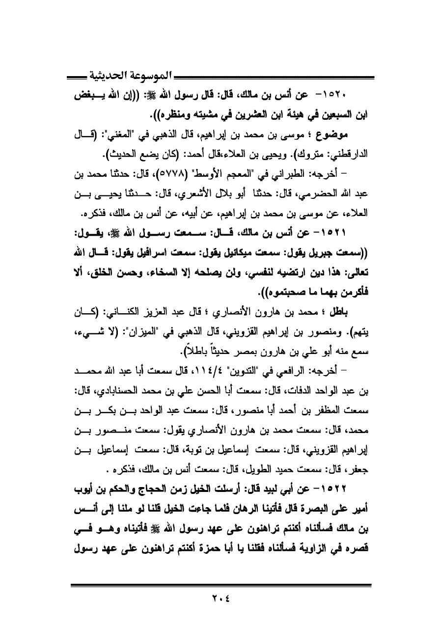 ١٥٢٠ - عن أنس بن مالك، قال: قال رسول الله - صلى الله عليه وسلم -: "إن الله يبغض ابن السبعين في هيئة ابن العشرين في مشيته ومنظره".