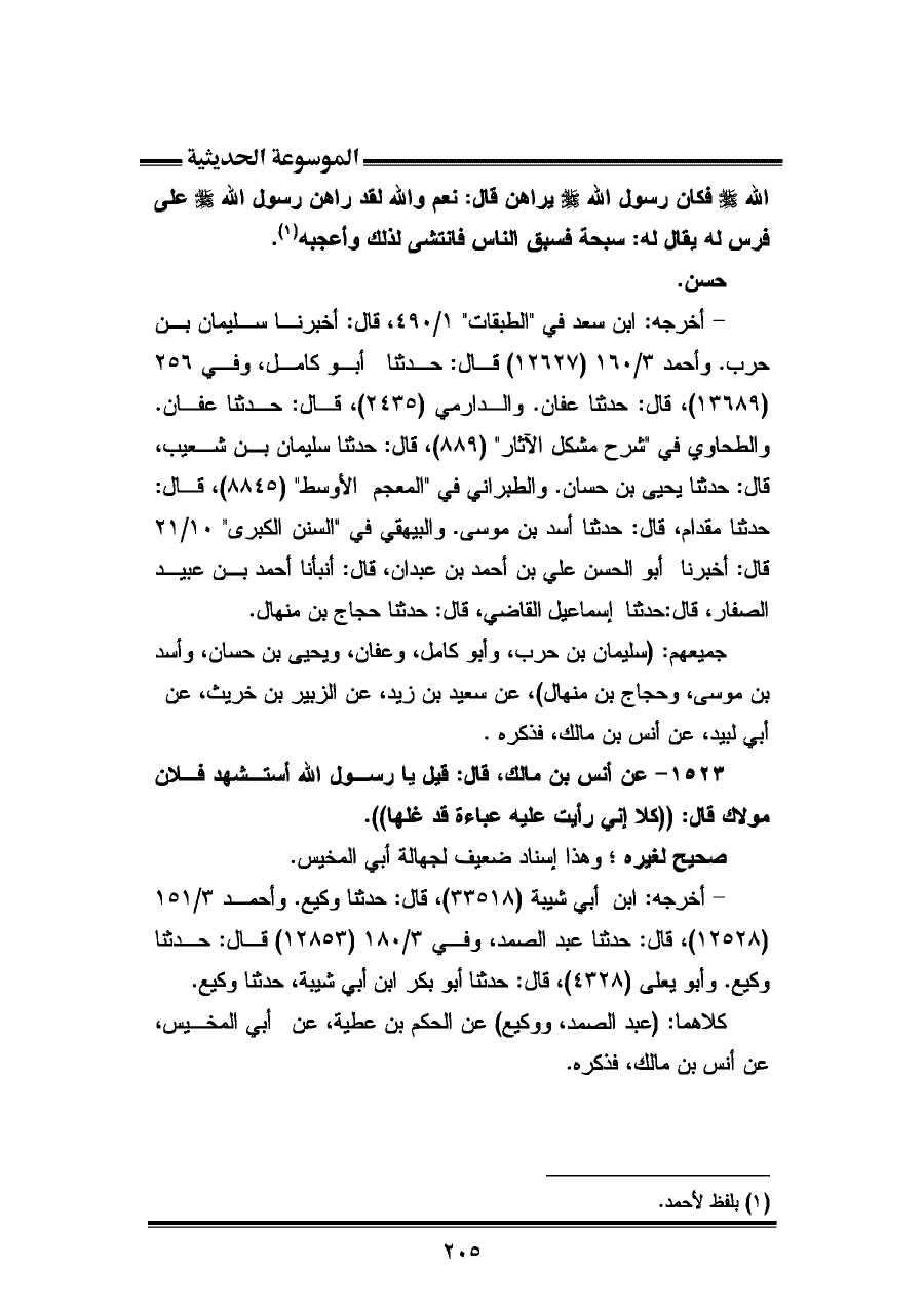 الله - صلى الله عليه وسلم - فكان رسول الله - صلى الله عليه وسلم - يراهن قال: نعم والله لقد راهن رسول الله - صلى الله عليه وسلم - على فرس له يقال له: سبحة فسبق الناس فانتشى لذلك وأعجبه (¬١).