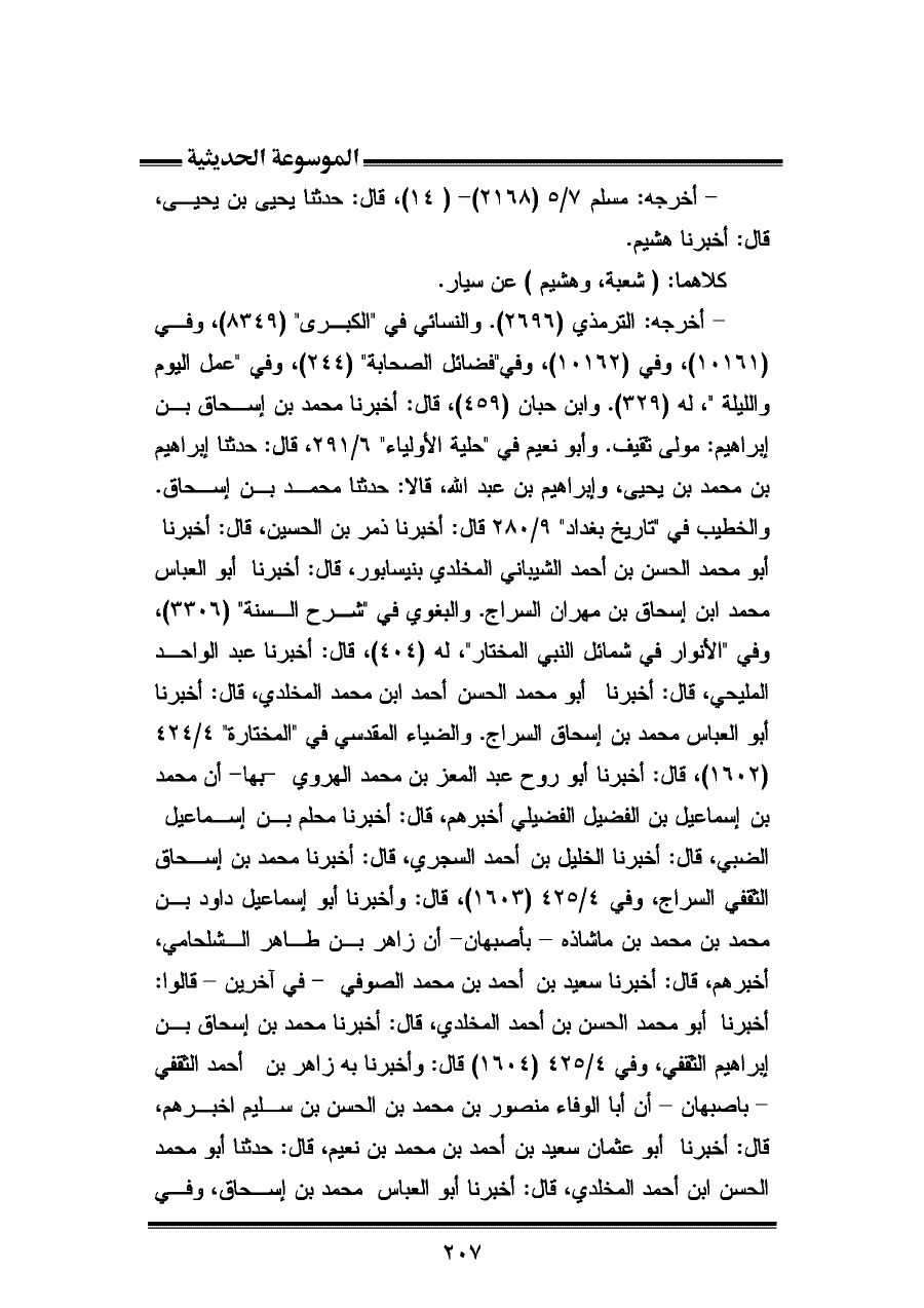 - أخرجه: الترمذي (٢٦٩٦). والنسائي في "الكبرى" (٨٣٤٩)، وفي (١٠١٦١)، وفي (١٠١٦٢)، وفي "فضائل الصحابة" (٢٤٤)، وفي "عمل اليوم والليلة"، له (٣٢٩). وابن حبان (٤٥٩)، قال: أخبرنا محمد بن إسحاق بن إبراهيم: مولى ثقيف. وأبو نعيم في "حلية الأولياء" ٦/ ٢٩١، قال: حدثنا إبراهيم بن محمد بن يحيى، وإبراهيم بن عبد الله، قالا: حدثنا محمد بن إسحاق. والخطيب في "تاريخ بغداد" ٩/ ٢٨٠ قال: أخبرنا ذمر بن الحسين، قال: أخبرنا أبو محمد الحسن بن أحمد الشيباني المخلدي بنيسابور، قال: أخبرنا أبو العباس محمد بن إسحاق بن مهران السراج. والبغوي في "شرح السنة" (٣٣٠٦)، وفي "الأنوار في شمائل النبي المختار"، له (٤٠٤)، قال: أخبرنا عبد الواحد المليحي، قال: أخبرنا أبو محمد الحسن أحمد ابن محمد المخلدي، قال: أخبرنا أبو العباس محمد بن إسحاق السراج. والضياء المقدسي في "المختارة" ٤/ ٤٢٤ (١٦٠٢)، قال: أخبرنا أبو روح عبد المعز بن محمد الهروي - بها - أن محمد بن إسماعيل بن الفضيل الفضيلي أخبرهم، قال: أخبرنا محلم بن إسماعيل الضبي، قال: أخبرنا الخليل بن أحمد السجري، قال: أخبرنا محمد بن إسحاق الثقفي السراج، وفي ٤/ ٤٢٥ (١٦٠٣)، قال: وأخبرنا أبو إسماعيل داود بن محمد بن محمد بن ماشاذه - بأصبهان - أن زاهر بن طاهر الشلحامي، أخبرهم، قال: أخبرنا سعيد بن أحمد بن محمد الصوفي - في آخرين قالوا: أخبرنا أبو محمد الحسن بن أحمد المخلدي، قال: أخبرنا محمد بن إسحاق بن إبراهيم الثقفي، وفي ٤/ ٤٢٥ (١٦٠٤) قال: وأخبرنا به زاهر بن أحمد الثقفي - بأصبهان أن أبا الوفاء منصور بن محمد بن الحسن بن سليم أخبرهم، قال: أخبرنا أبو عثمان سعيد بن أحمد بن محمد بن نعيم، قال: حدثنا أبو محمد الحسن بن أحمد المخلدي، قال: أخبرنا أبو العباس محمد بن إسحاق، وفي