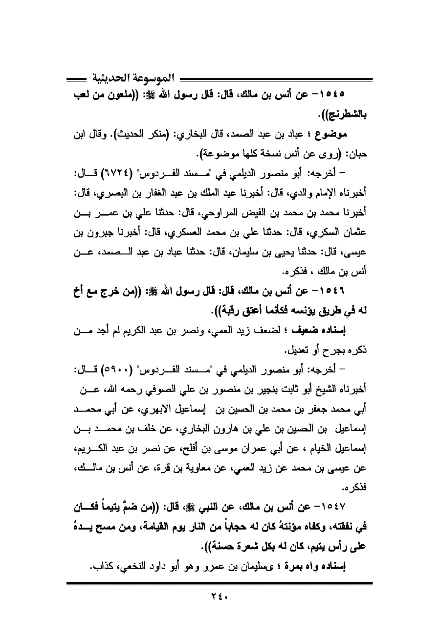 ١٥٤٩ - عن أنس بن مالك، عن النبي - صلى الله عليه وسلم -، قال: "من أصلح بين اثنين أصلح الله أمره، وأعطاه بكل كلمة تكلَّم بينهما عِتْقُ رقبة، ورجع مغفورًا له ما تقدم من ذنبه".