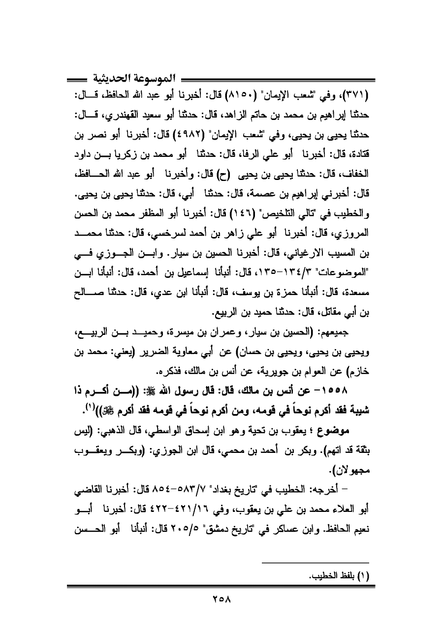 ثلاثتهم: (محمد بن علي بن يعقوب، وأبو نعيم الحافظ، ومحمد بن أحمد) عن أبي القاسم (¬١) بكر بن أحمد بن محمي بن كثير بن صالح الواسطي الخباز، قال: حدثنا أبو يوسف يعقوب بن تحية، قال: حدثنا يزيد ببن هارون، عن حميد، عن أنس، فذكره.