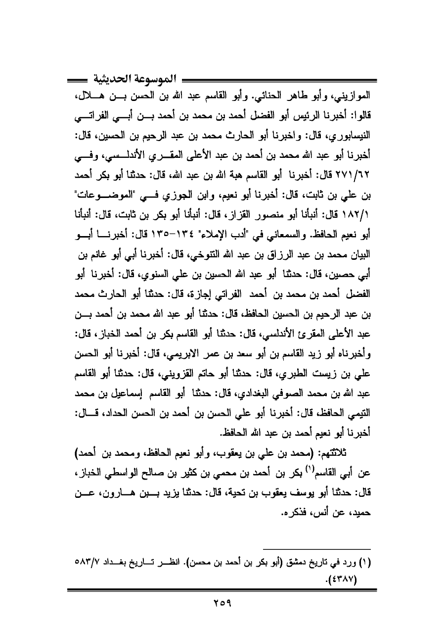 - أخرجه: الطبراني في "المعجم الأوسط" (٧٥٦) قال: حدثنا أحمد بن داود المكي، قال: حدثنا العباس بن الفضل الأزرق، قال: حدثنا حماد بن سلمة، عن ثابت. وأبو الشيخ في "طبقات المحدثين" (٣٧٤) قال: حدثنا ابن المقرئ، قال: حدثنا إبراهيم بن ناصح، قال: حدثنا النضر بن شميل، قال: حدثنا عوف عن الحسن. والخطيب في "المتفق والمفترق" (٢٥٩). قال: أخبرنا القاضي أبو العلاء: محمد بن علي الواسطي، قال: حدثنا أبو زرعة: أحمد بن الحسين الرازي، قال: حدثنا لاحق بن الحسين الصدري. وابن عساكر في "تاريخ دمشق" ١١/ ٢٥٦ قال: قرأت على أبي محمد السلمي، عن أبي بكر أحمد بن محمد بن علي الخطيب، قال: أنبأنا القاضي أبو العلاء محمد بن علي الواسطي، قال: أنبأنا أبو زرعة أحمد بن الحسن الرازي، قال: حدثنا لاحق بن الحسين المنذري، قال: أنبأنا بهر. كلاهما: (لاحق، وبهز) عن عبد الرحمان بن أحمد بن سعيد المهدي، عن محمد بن صالح المهدي، عن محمد بن (¬٢) حرب الخولاني، عن محمد بن راشد بن عمرو الحبطي، عن جميل بن معمر.