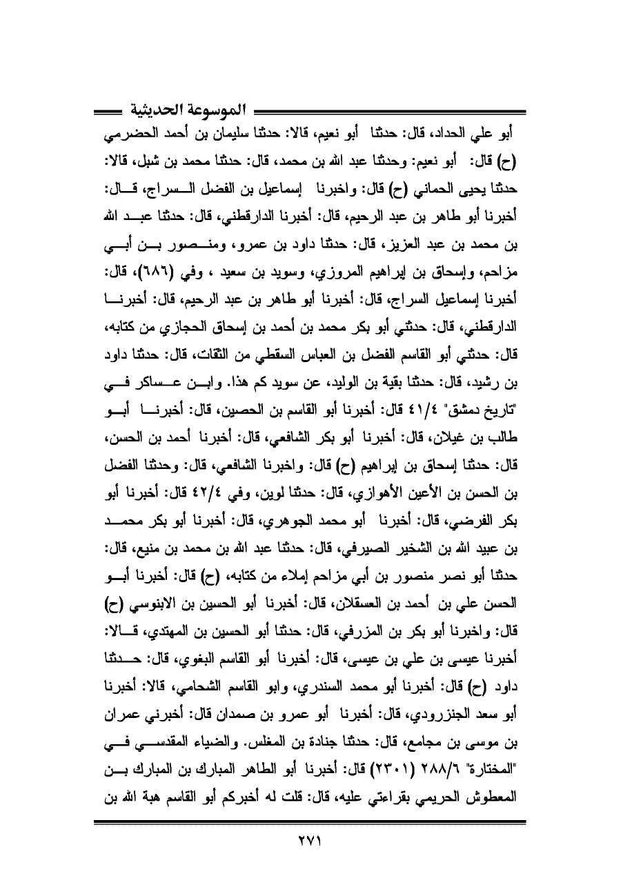 محمد بن الحصين فأقربه، قال: أنبأنا أبو علي الحسن بن علي بن المذهب، قال: أنبأنا أبو بكر أحمد بن جعفر القطيعي، قال: حدثنا عبد الله بن أحمد، قال: حدثنى أبي، قال: حدثنا أبو أسامة (ح) قال: أخبرنا أبو الطاهر المبارك بن المبارك بن المعطوش الحريمي بقراءتي عليه، قال: قلت له أخبركم أبو القاسم هبة الله بن محمد بن الحصين فأقربه، قال: أنبأنا أبو علي الحسن بن علي بن المذهب، قال: أنبأنا أبو بكر أحمد بن جعفر القطيعي، قال: حدثنا عبد الله بن أحمد، قال: حدثني أبي، قال: حدثنا حجاج. وفي ٦/ ٢٨٨ (٢٣٠٣) قال: وأخبرنا محمود بن محمد بن محمود الحداد، قال: أن مسعود بن الحسن الثقفي أخبرهم، قال: أنبأنا محمد بن أحمد بن علي السمسار، قال: أنبأنا إبراهيم بن عبد الله بن خرشيد قوله، قال: حدثنا الحسين بن إسماعيل المحاملي، قال: حدثنا سعيد بن يحيى، قال: حدثنا أبو أسامة، وفي ٦/ ٢٨٩ (٢٣٠٤) قال: أخبرنا أبو الفرج عبد الرحمان بن أحمد بن محمد العمري، قال: أن هبة الله بن محمد أخبرهم، قال: أنبأنا أبو طلب محمد بن محمد، قال: أنبأنا أبو بكر محمد بن عبد الله الشافعي، قال: حدثنا أحمد بن الحسن، قال: حدثنا إسحاق بن إبراهيم (ح)، وفي (٢٣٠٥) قال: أخبرنا أبو الفرج عبد الرحمان بن أحمد بن محمد العمري، قال: أن هبة الله بن محمد أخبرهم، قال: أنبأنا أبو طالب محمد بن محمد، قال: قال: الشافعي وحدثنا الفضل بن الحسن بن الأعين الأهوازي، قال: حدثنا لوين، وفي ٤/ ٢٨٩ - ٢٩٠ (٢٣٠٦) قال: وأخبرنا زاهر بن أحمد بن حامد الثقفي، قال: أن سعيد بن أبي الرجاء الصيرفي أخبرهم، قال: أنبأنا عبد الواحد بن أحمد بن محمد البقال، قال: أنبأنا عبيد الله بن يعقوب بن إسحاق، قال: أنبأنا جدي إسحاق بن إبراهيم بن محمد بن جميل، قال: أنبأنا أحمد بن منيع، قال: حدثني أبي نصر.