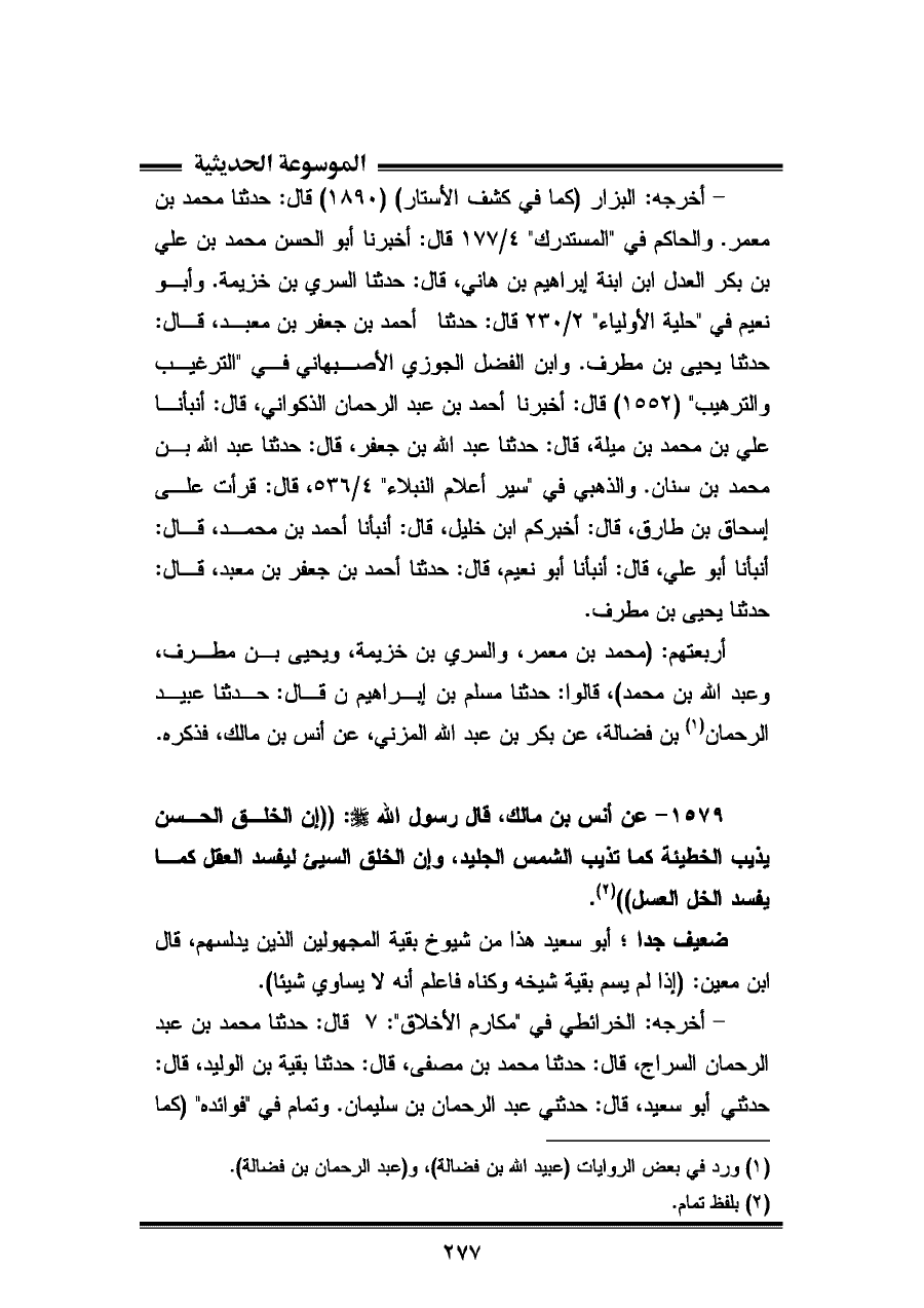 - في رواية الخرائطي لم يذكر "وإن الخلق السيئ ليفسد العقل كما يفسد الخل العسل".